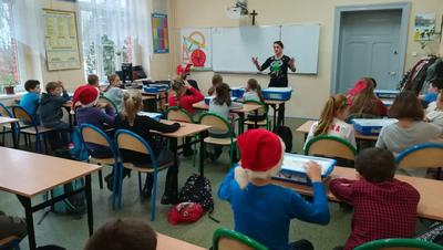 W dniu 6 grudnia podczas 4 lekcji na hali sportowej zagościł u nas Święty Mikołaj z workiem pełnym smakołyków dla wszystkich uczniów klas IV-VIII. O zaproszenie, transport,pomoc i ugoszczenie Świętego Mikołaja w naszej szkole zadbała niezawodna Rada rodziców.