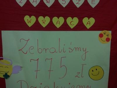 21 listopada 2019 roku w dniu Światowego Dnia Życzliwości i Pozdrowień , Szkolne Koło Wolontariatu zorganizowało pierwszą zbiórkę pieniężną dla Dzieci z Hospicjum we Wrocławiu. Zbiórka poległa na tym że uczniowie kl. 4-8, nauczyciele, rodzice , pracownicy administracji i obsługi , mogli zakupić ciasto , upieczone przez dziewczyny ze Szkolnego Koła Wolontariatu. Ciasto sprzedawane było podczas drugiej i trzeciej przerwy lekcyjnej. Zebraliśmy 775 zł !!!!!!!!! Bardzo dziękujemy . !!!!!!! JESTEŚMY WIELCY! Dobro zawsze wraca !!!!!! Pieniądze zostaną przesłane na konto Hospicjum we Wrocławiu. Nasza Ekipa Wolontariuszy: 1. Oliwia Kałafut kl. 6a 2. Martyna Zdrowiecka kl. 6 a 3. Zuzanna Bober kl. 6 e 4. Miłosz Naparty kl. 6 e 5. Anna Kowalska kl. 6 e 6. Zuzanna Brodala kl. 6 e 7. Hanna Ławniczak kl. 7 b 8. Aleksandra Szczotka kl. 7 b 9. Nicol Szajek kl. 7 b 10. Amelia Cegielnik kl. 7 b 11. Marlena Mroczka kl. 7 b 12. Natalia Wałkiewicz kl. 7 b Ciasto upiekły: 1. Zuzanna Bober kl. 6 e 2. Anna Kowalska kl. 6 e 3. Zuzanna Brodala kl. 6 e 4. Maja Sajewicz kl. 6 a 5. Kaja Sajewicz kl. 5 a 6. Oliwia Kałafut kl. 6 a 7. Martyna Zdrowiecka kl. 6 a 8. Hanna Ławniczak kl. 7 b 9. Amelia Cegielnik kl 7 b 10. Nicol Szajek kl. 7 6 11. Aleksandra Tarbaj kl. 7 c Komisja , która liczyła pieniądze.: 1. Michał Jędra kl. 6 d 2. Maja Sajewicz kl 6 a 3. Martyna Zdrowiecka kl. 6 a 4. Zuzanna Bober kl. 6 e 5. Anna Kowalska kl. 6 e 6. Amelia Wójcik kl. 5 c Pozdrawiamy Szkolne Koło Wolontariatu opiekun Monika Bagińska