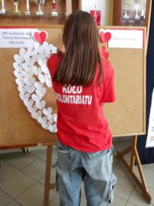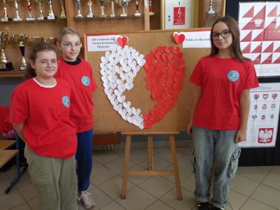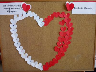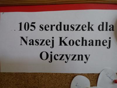 105 serduszek z okazji 105 rocznicy odzyskania Niepodległości przez Polskę Szolne Koło Wolontariatu zorganizowało akcję dla uczniów klas 4-8 i nauczycieli z okazji Narodowego Święta Niepodległości. Hasło akcji to: Polska to dla mnie... Uczniowie i Nauczyciele wykonali jedno biało- czerwone serce z 105 serduszek. Na serduszka uczniowie i nauczyciele zapisywali słowa, zdania , które kończyły zdanie Polska to dla mnie... a to przykładowe wpisy : Rodzina, Ojczyzna, Przyjaciele, Wiara, Dom, Rosół, Flaga, Hymn Dziękujemy za udział w tej akcji i za radosne świętowanie 105 rocznicy odzyskania Niepodległości. Pozdrawiamy Szkolne Koło Wolontariatu
