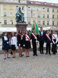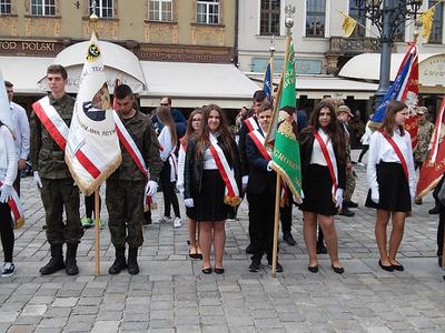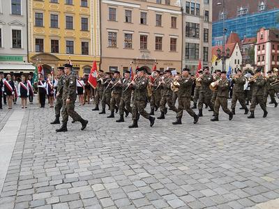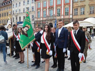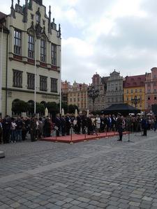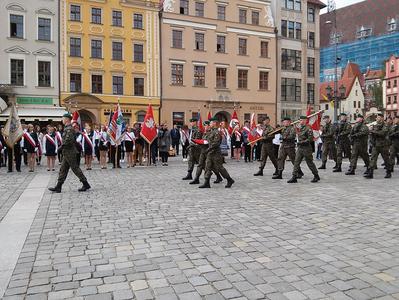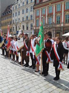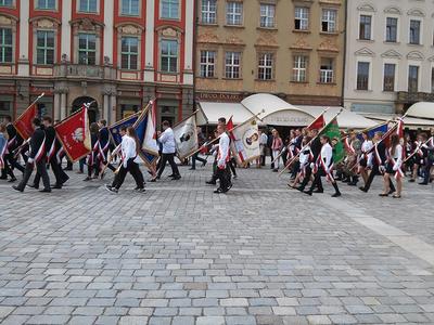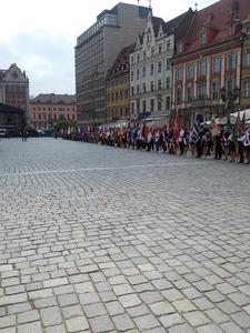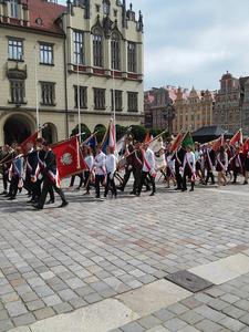 Poczet Sztandarowy na uroczystym podsumowaniu IX akcji "Mogiłę Pradziada Ocal od Zapomnienia"- uroczysta defilada pocztów sztandarowych na wrocławskim Rynku.