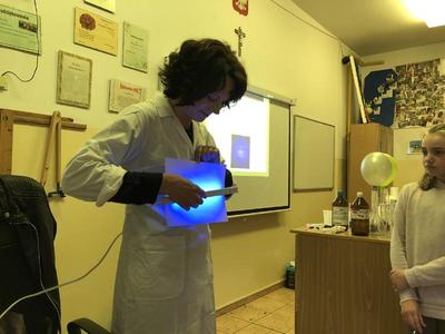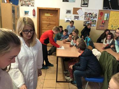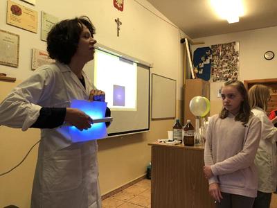 9 maja odbyły się w naszej szkole pokazy fizyczno – chemiczne prezentowane przez doktorantki Politechniki Wrocławskiej w ramach projektu „Żmigrodzkie szkoły na wysokim poziomie”, realizowanego przez Fundację „W drogę”, współfinansowanego ze środków Unii Europejskiej - Europejskiego Funduszu Społecznego. W pięciu godzinnych pokazach uczestniczyło w sumie 250 uczniów z klas: 8a, 8b, 8c, 8d, 8e, 7a, 7b, 7c, 6a, 6b, 6c i 5f. W trakcie pokazów fizyczno-chemicznych zaprezentowane zostały zjawiska związane z napięciem powierzchniowym cieczy. Z kolei doświadczenia chemiczne, w których aktywnie uczestniczyli uczniowie, wyjaśniły na czym polega zjawisko chromizmu, jakie są jego rodzaje i gdzie zjawisko to znajduje zastosowanie praktyczne. Pokazy bardzo się podobały, doświadczenia dostarczyły wszystkim obecnym wielu niezapomnianych przeżyć i emocji. Szkolny opiekun projekt: Anna Wołoszyn
