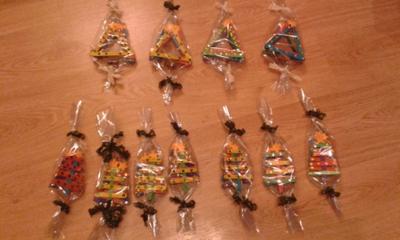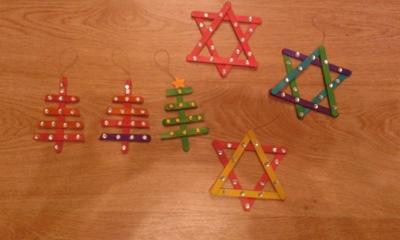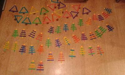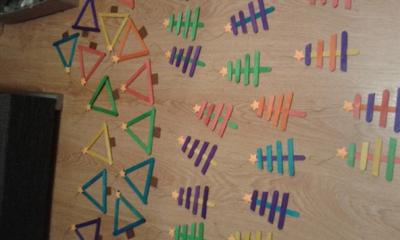 Uczniowie dekorowali cekinami choinki wykonane dzień wcześniej przez Panią Barbarę Robińska z kolorowych patyczków do lodów.