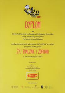 Nasza szkoła bierze udział w 8 edycji programu „Żyj smacznie i zdrowo”. Celem tej akcji jest promowanie wśród uczniów szkół zasad prawidłowego i smacznego odżywiania. Eliza Łuszczyk z klasy 7C została wyróżniona za przygotowanie Autorskiej Karty Dania jak najlepiej odpowiadającej wydarzeniu KLASÓWKA.