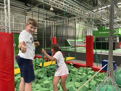Nasza klasa 11 czerwca 2021 r. wybrała się na aktywny wypoczynek do parku trampolin we Wrocławiu. Pobyt w parku rozpoczęliśmy rozgrzewką z trenerem. Zestaw ćwiczeń rozgrzewających a zarazem przygotowujących nas do aktywnej zabawy okazał się bardzo przydatny. Korzystając z atrakcji parku mieliśmy możliwość sprawdzenia swojej kondycji fizycznej po dłuższej przerwie związanej z pandemią. Ćwiczyliśmy równowagę na gąbkach i gibkość na trampolinach. Pokonywaliśmy przeszkody, korzystaliśmy ze zjeżdżalni oraz boiska na którym graliśmy w piłkę. Przez dwie godziny dobrej zabawy towarzyszyła nam świetna muzyka.