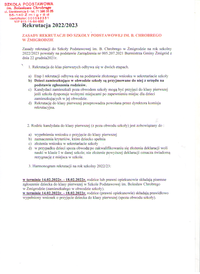 Zapraszamy do zapoznania się z zasadami rekrutacji do Szkoły Podstawowej im.Bolesława Chrobrego w Żmigrodzie.