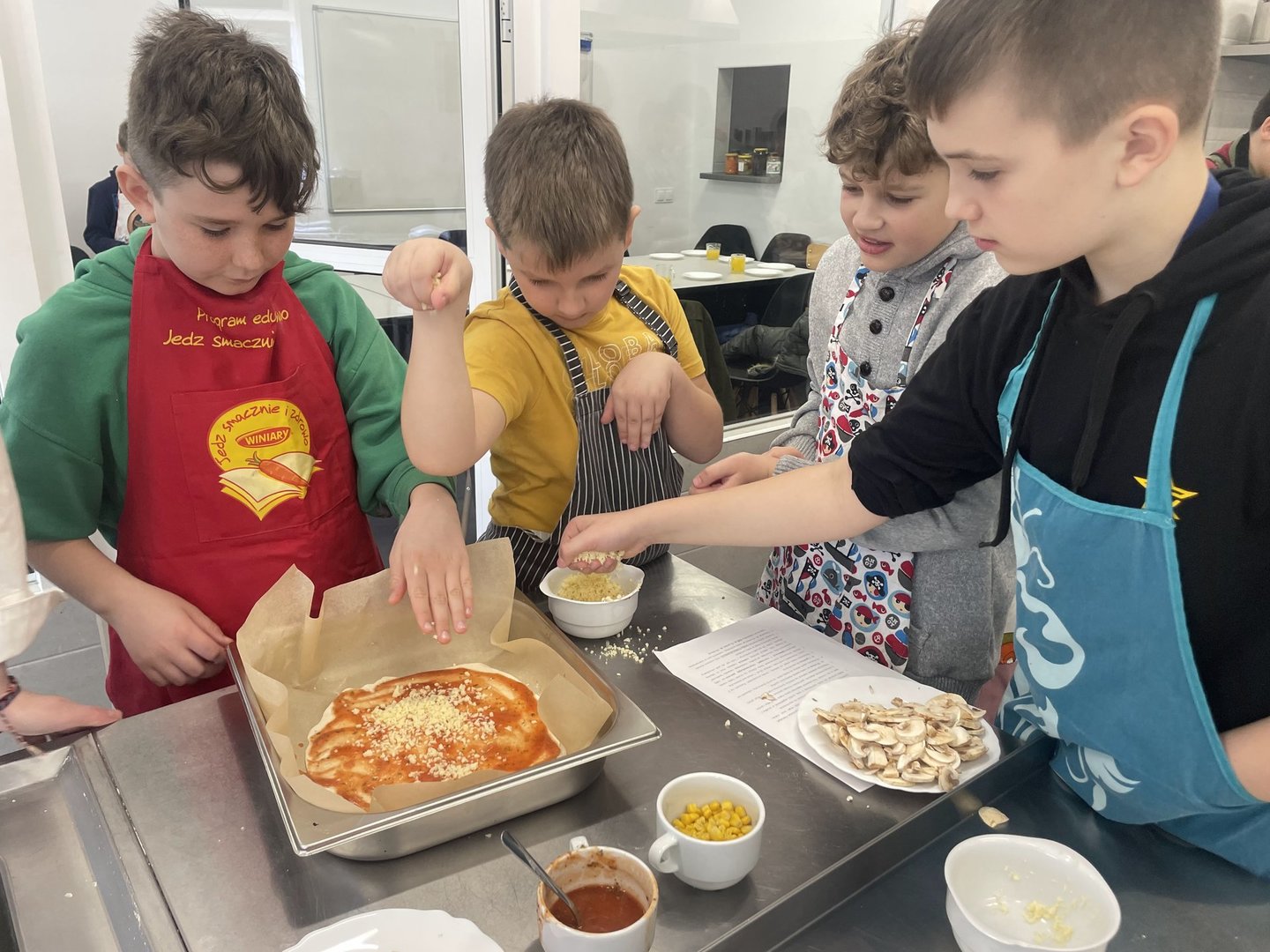 W ramach realizacji projektu edukacyjnego „Gotuj się na zmiany” klasa 5a uczyła się pieczenia pizzy, dobierając składniki bogate w minerały i witaminy. Pizza jest daniem dobrze zbilansowanym, szczególnie jeżeli do jej zrobienia używa się wysokiej jakości oliwy, sosu z prawdziwych pomidorów i świeżych warzyw oraz dobrego sera. Zawiera spore ilości węglowodanów, ale także białka, witamin, tłuszczów i żelaza. Jedzona raz na jakiś czas, z umiarem, na pewno nikomu nie zaszkodzi.