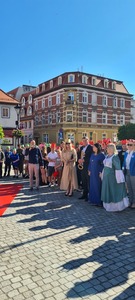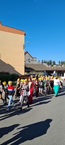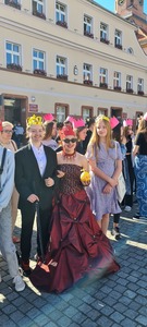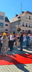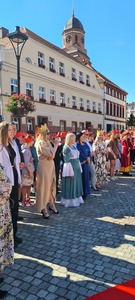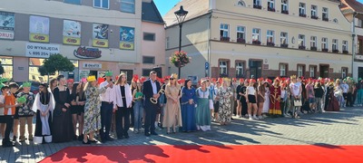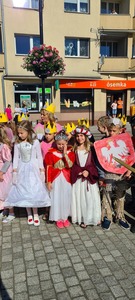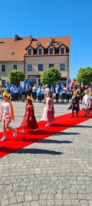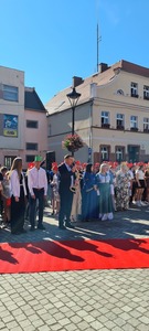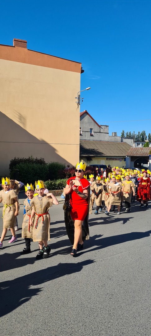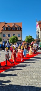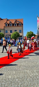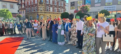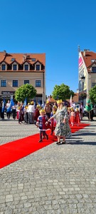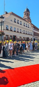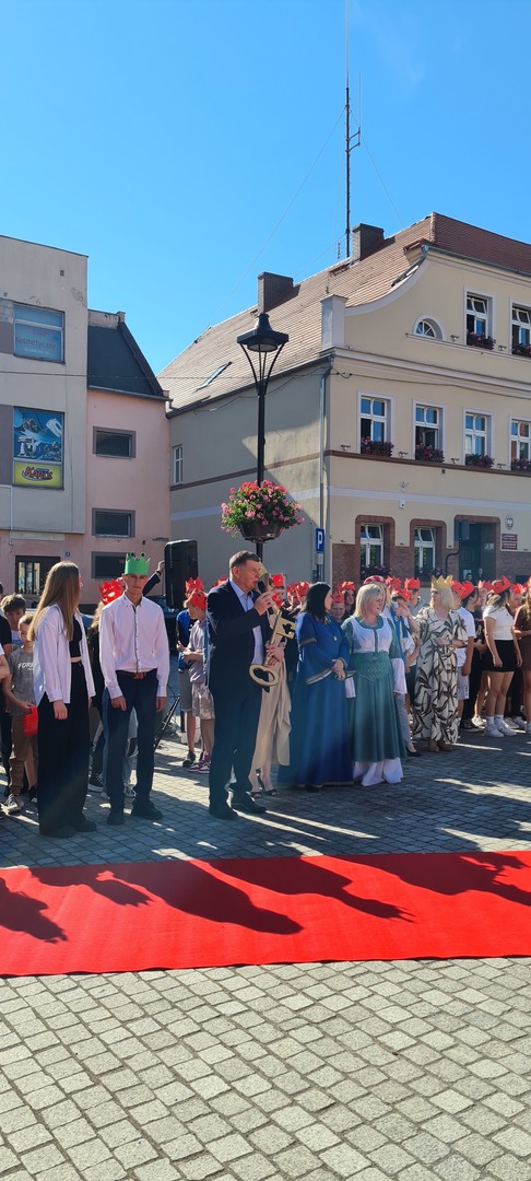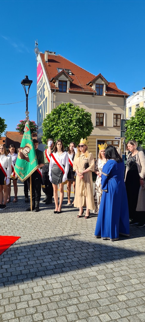 Później zaprezentowali się uczniowie pięknie przebrani za króla Chrobrego, rycerzy, królowe i damy dworu. Najlepsze przebrania zostały nagrodzone, ale wszyscy zgodnie twierdzili, że cała szkoła zasługuje na nagrodę. Takiej ilości koronowanych głów na rynku jeszcze nie było!!! Do tego fanfar, werbli, pocztu sztandarowego i całej naszej szkolnej rodziny. A przypomnijmy, że nasza szkoła to ponad 700 uczniów, ponad 60 nauczycieli i 20 pracowników obsługi.