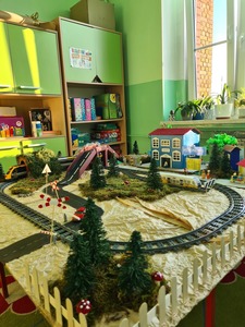 Nasi najmłodsi uczniowie samodzielnie wykonali elementy makiety, dbając o najmniejsze szczegóły. Peronowo🚇 ma m.in. podświetlany budynek stacji kolejowej, sterowany, jeżdżący pociąg 🚞, wiadukt🏡, tunel🛤 , a co najważniejsze bezpieczny przejazd kolejowy, którego bacznie dogląda nosorożec Rogatek 🦏.