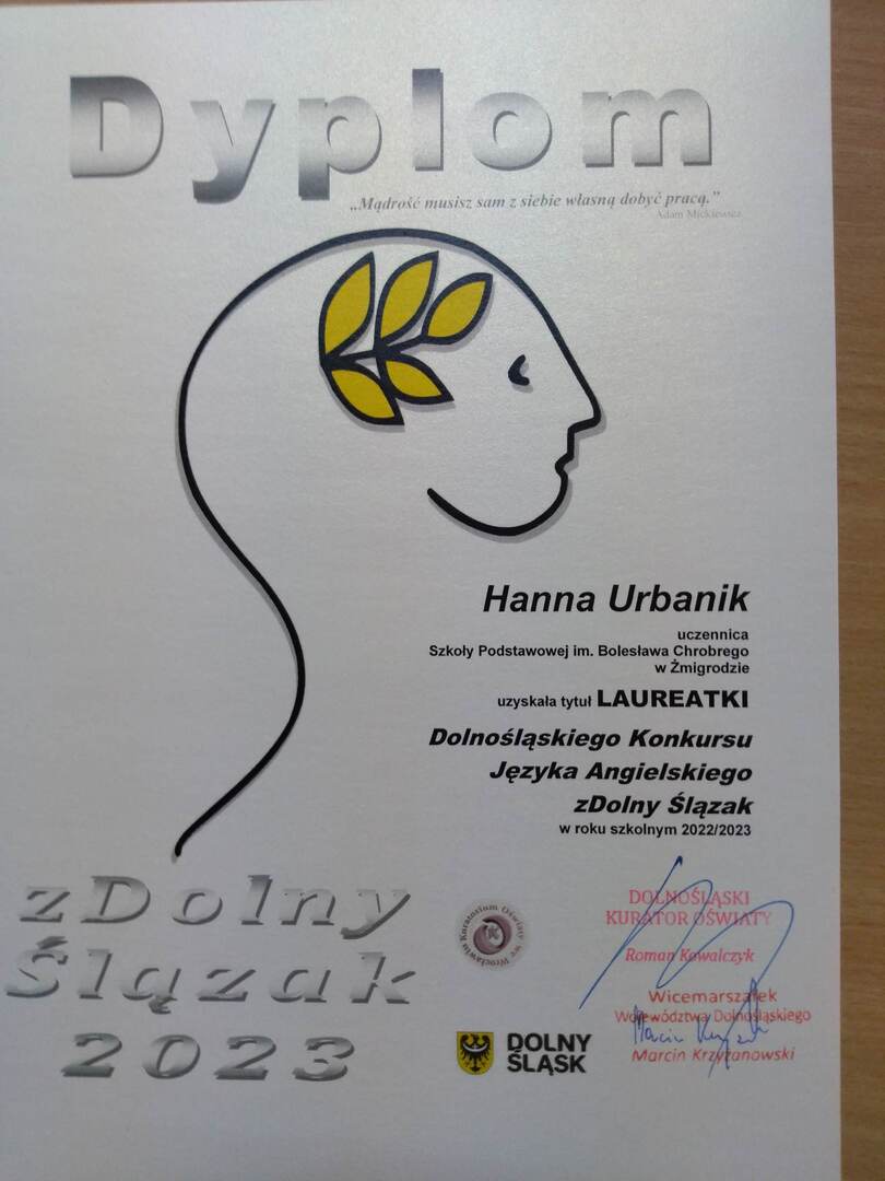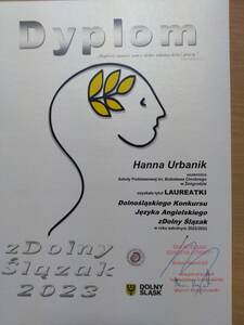 Hania Urbanik została Laureatką konkursu języka angielskiego. Jest to bardzo wysokie osiągnięcie, pokazujące pasję, talent językowy oraz pracowitość. Hania od klasy siódmej realizuje Indywidualny Program Nauki Języka Angielskiego. W tym roku szkolnym ona również została Finalistką XV dolnośląskiego konkursu języka angielskiego dla uczniów klas ósmych „Union Jack”.