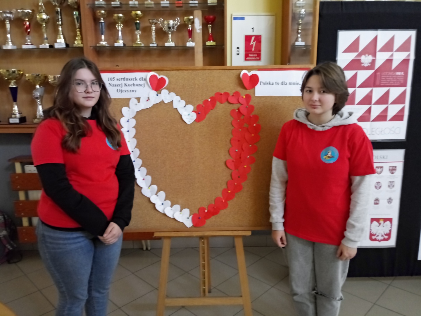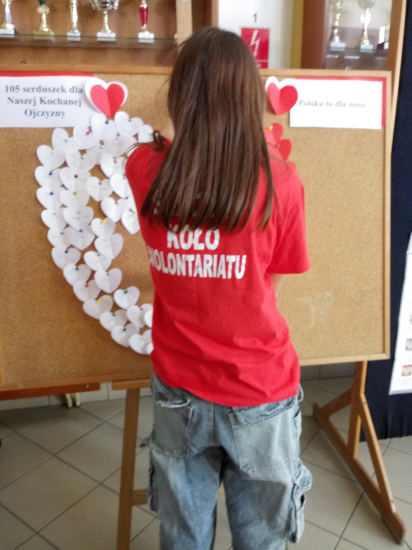 Uczniowie i Nauczyciele wykonali jedno biało- czerwone serce z 105 serduszek.