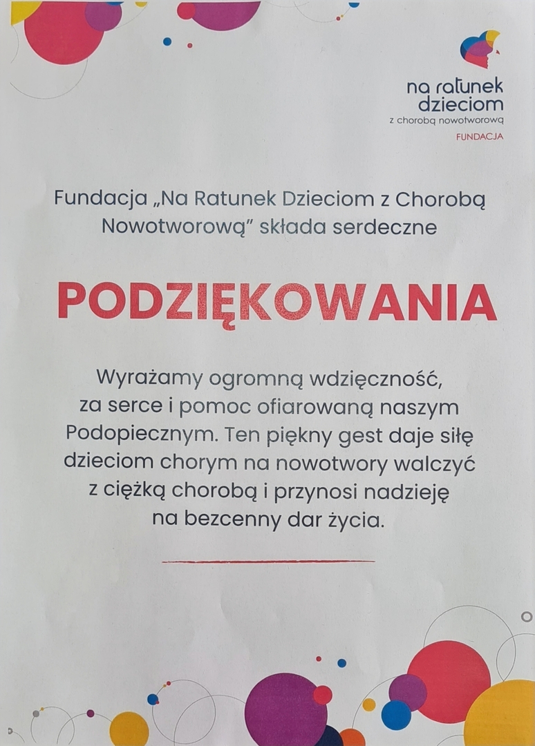 Fundacja Na Ratunek Dzieciom z Chorobą Nowotworową zorganizowała akcję charytatywną dla dzieci chorych onkologicznie. W naszej szkole odbyła się akcja zbiórki pluszaków. Akcja miała na celu uwrażliwienie naszych uczniów na potrzeby i cierpienie drugiego człowieka oraz wniesienie trochę radości i uśmiechu na twarze przebywających tam małych pacjentów.