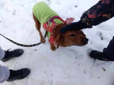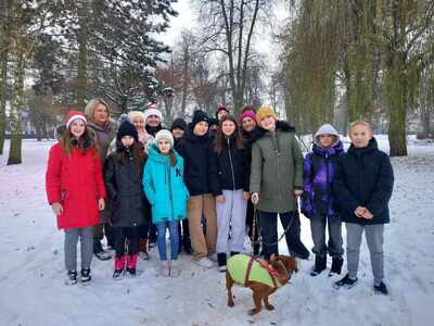 Mikołajkowe spotkanie ze Żmigrodzkim Klubem Przyjaciół Zwierząt. Klasa 5a w ramach mikołajkowego dzielenia się radością zebrała pieniądze na rzecz zwierzat będących pod opieką Żmigrodzkiego Klubu Przyjaciół Zwierząt. Dzisiaj byliśmy na wspólnym spacerze z Nutka, która w dalszym ciągu czeka na adopcję. Czy ma szansę na mikołajkowa radość u ludzi, którzy obdarzą ja miłością i ciepłem? Mamy nadzieję, że tak. Serca uczniów klasy 5a podbiła.