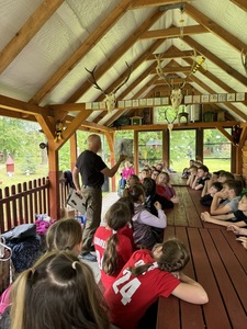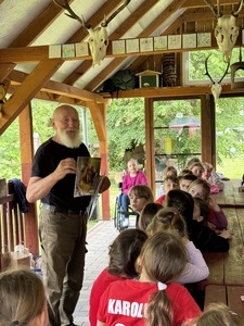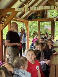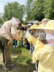 Zakładając specjalne pszczelarskie stroje, mieliśmy możliwość zobaczenia, jak wygląda świat oczami pszczelarza. Obdarowani słoiczkiem miodu, w pełni usatysfakcjonowani, zakończyliśmy warsztaty. Jednak w pięknych okolicznościach przyrody był jeszcze czas na zabawy i ognisko.