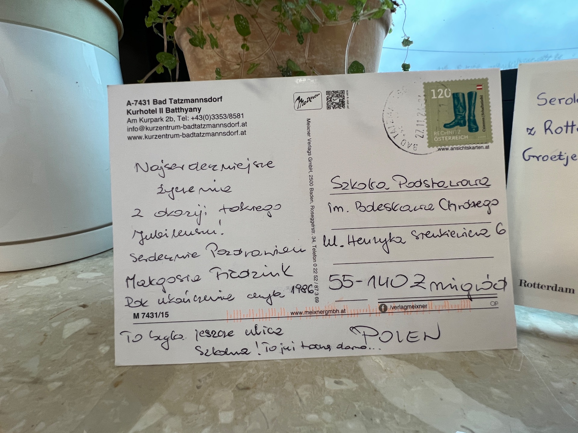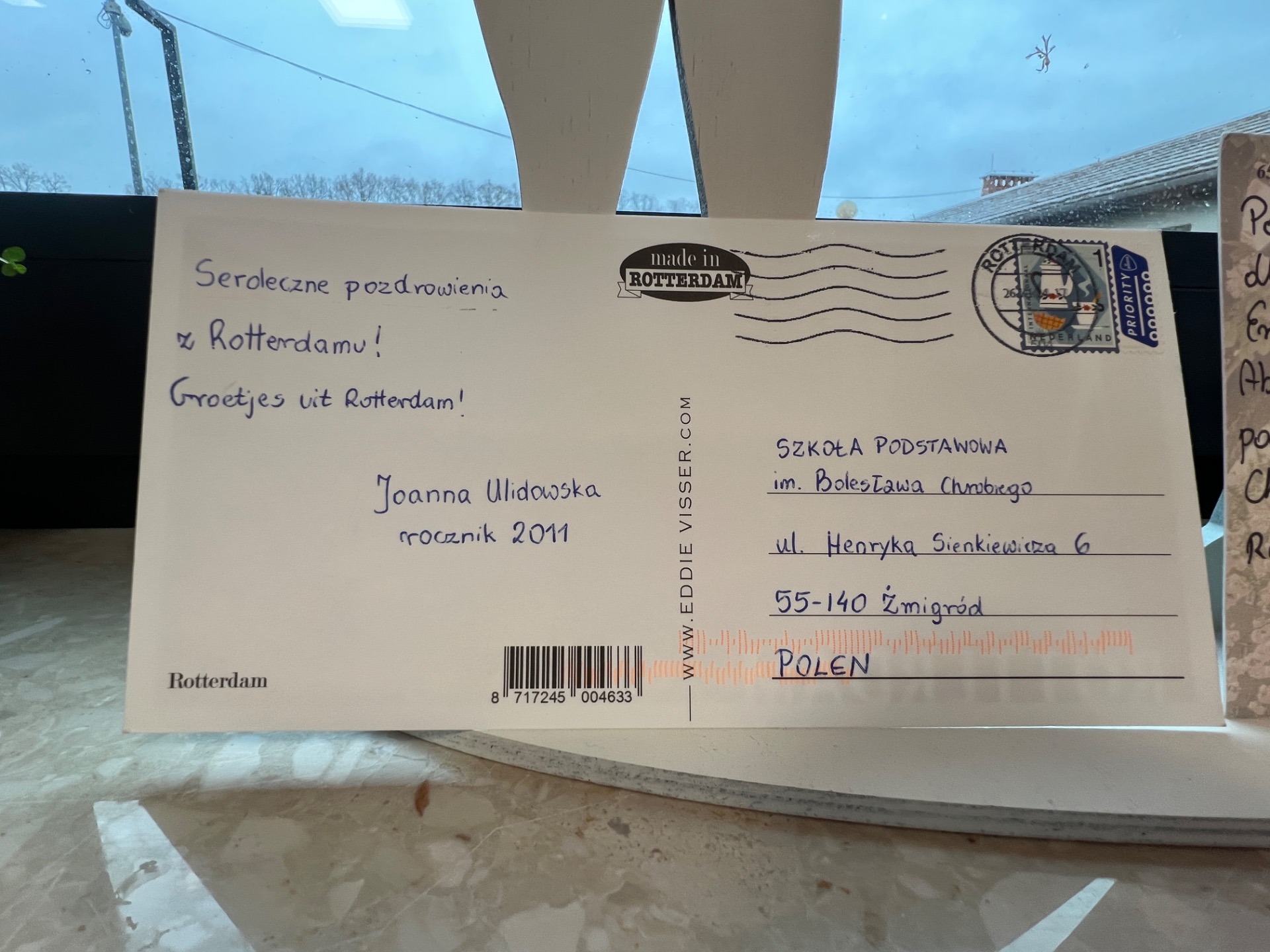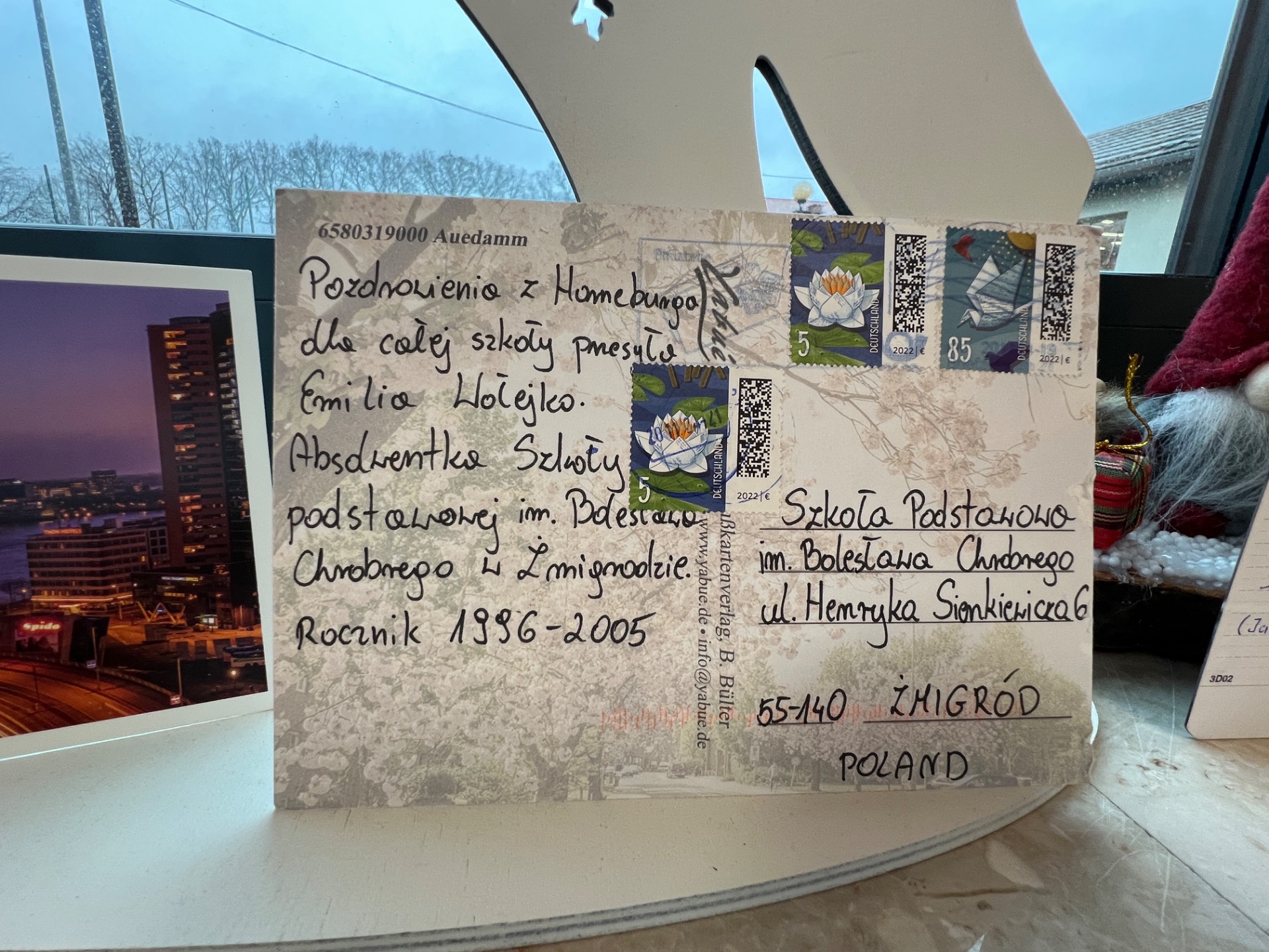 Dziękujemy z całego serca za tę piękną pamiątkę oraz wszystkie inne pocztówki, które od Was otrzymujemy. Dzięki Wam nasza mapa wypełnia się inspirującymi historiami i pokazuje, jak szeroko sięgają korzenie naszej szkolnej społeczności.