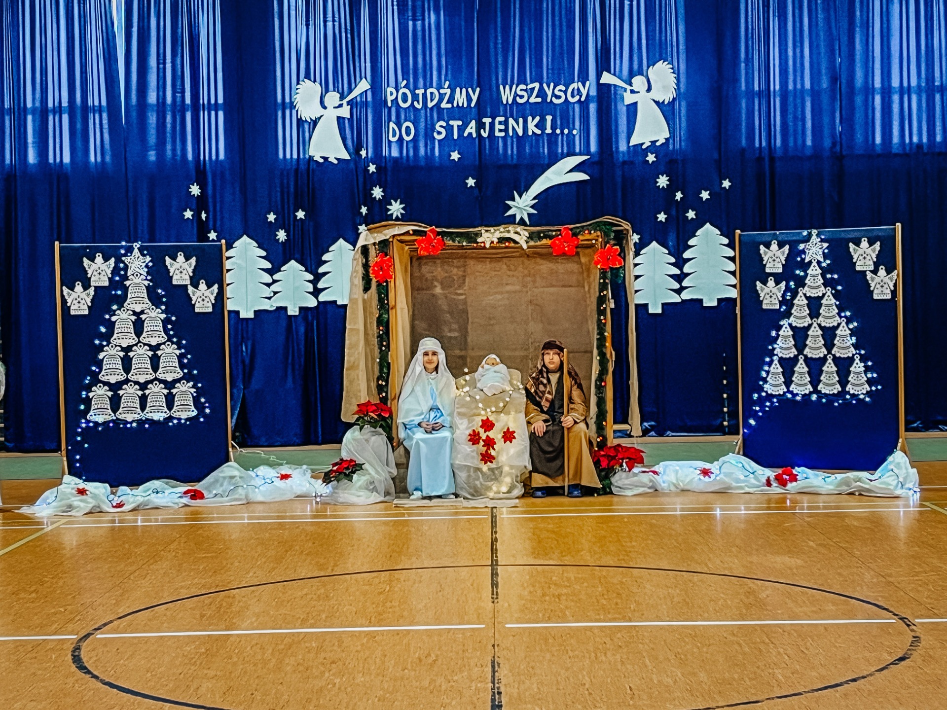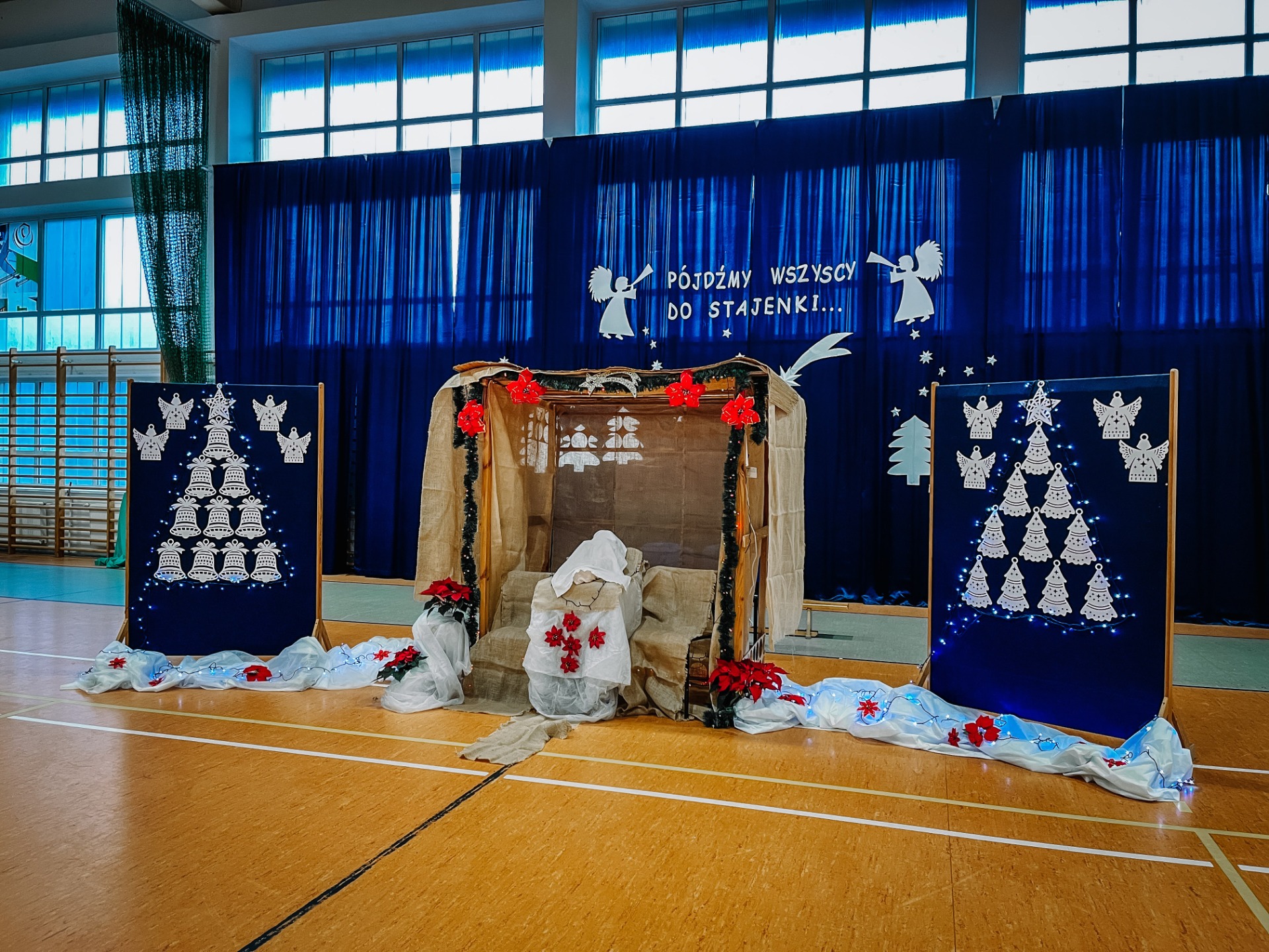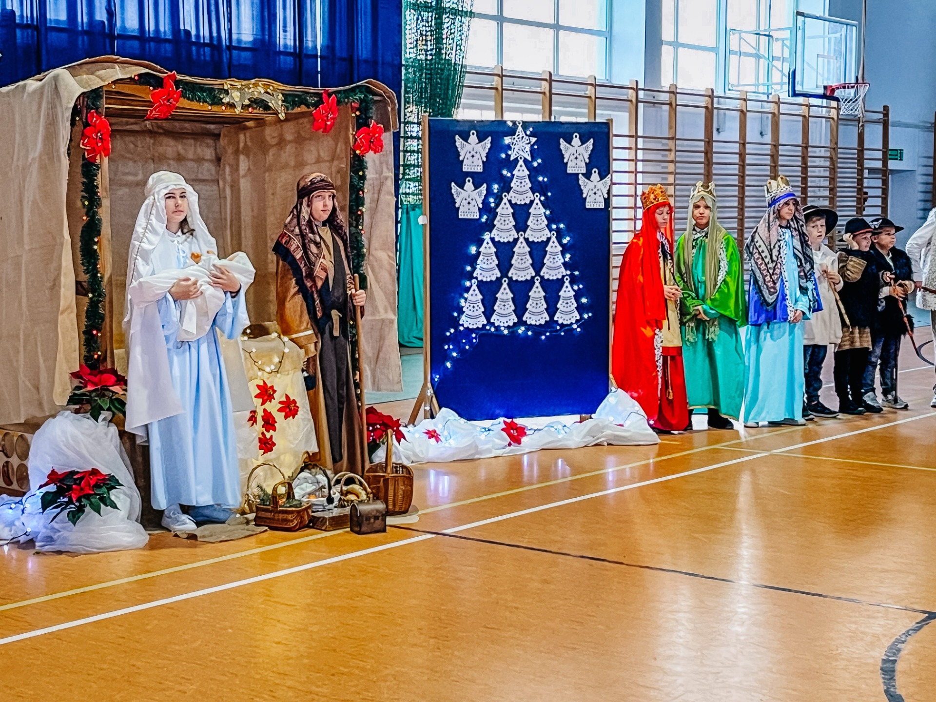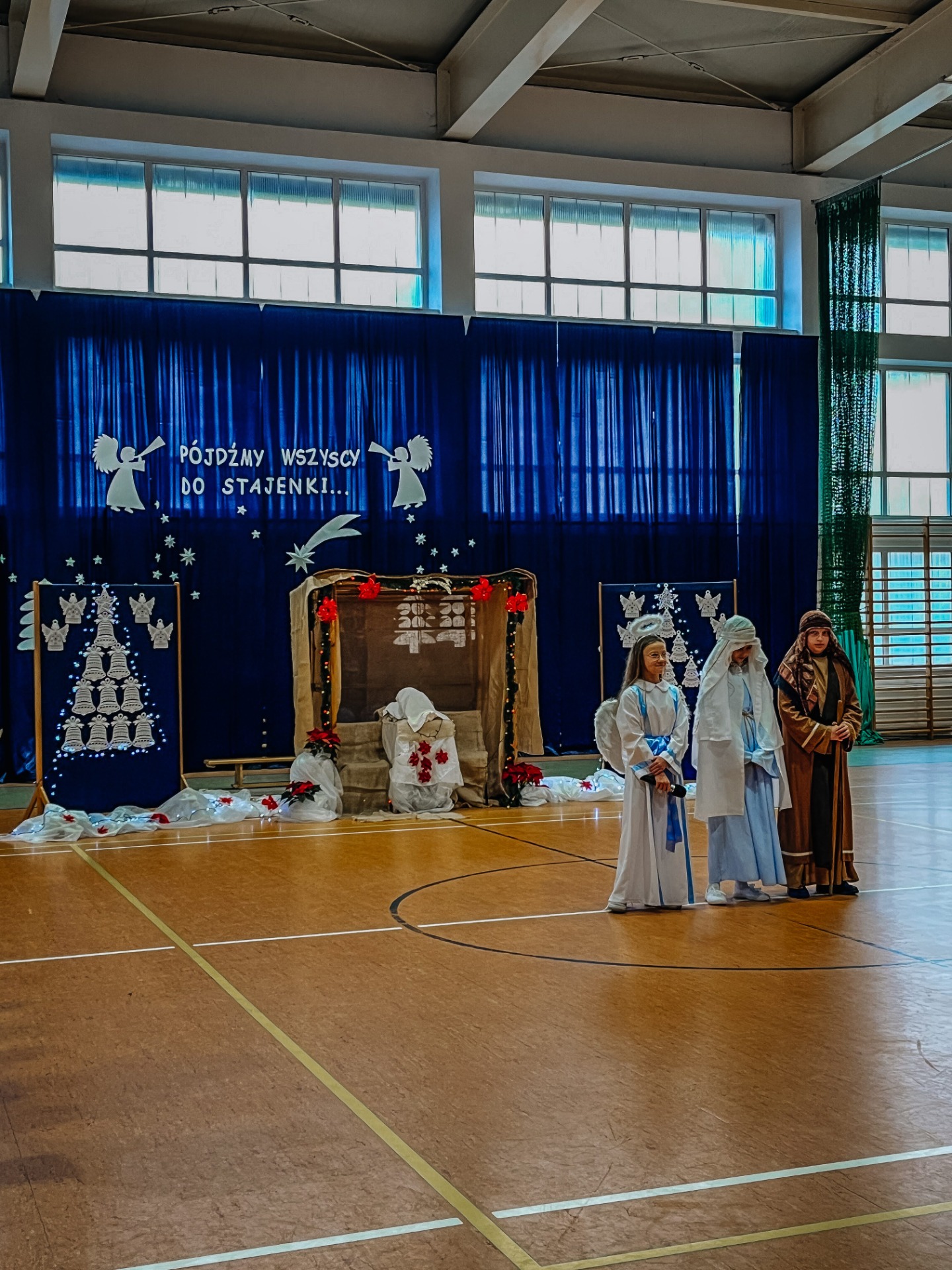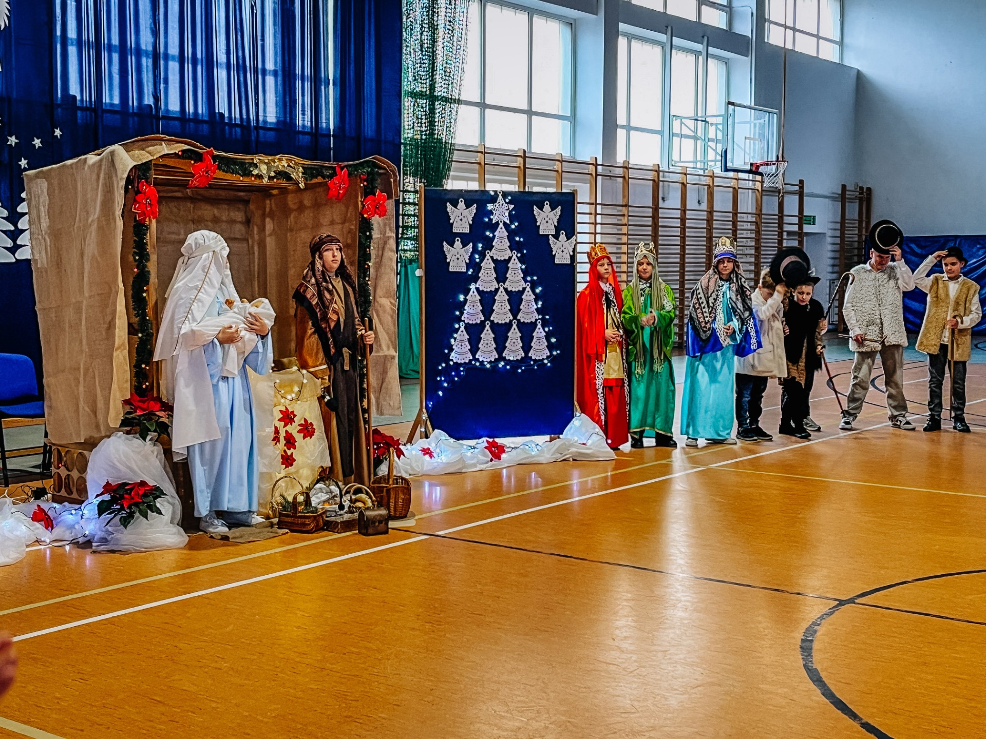 W dniu 20 grudnia 2024 roku o godzinie 9.00 na hali sportowej w naszej szkole odbyły się Jasełka w wykonaniu uczniów z klasy 1d i 6c oraz zespółu wokalnego dla całej społeczności szkolnej.