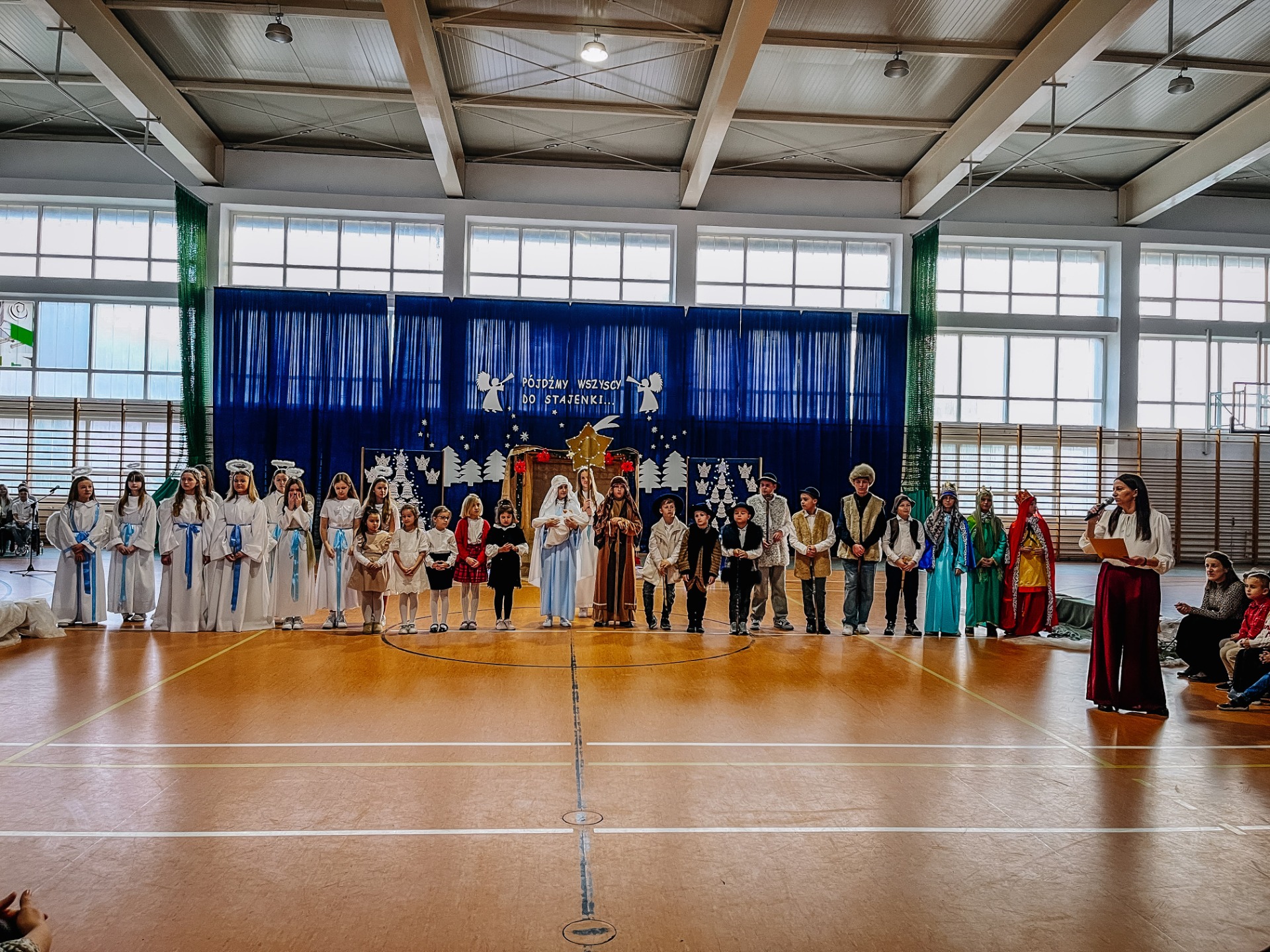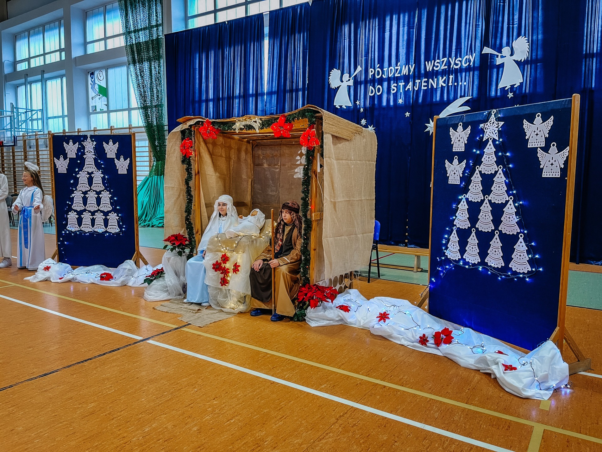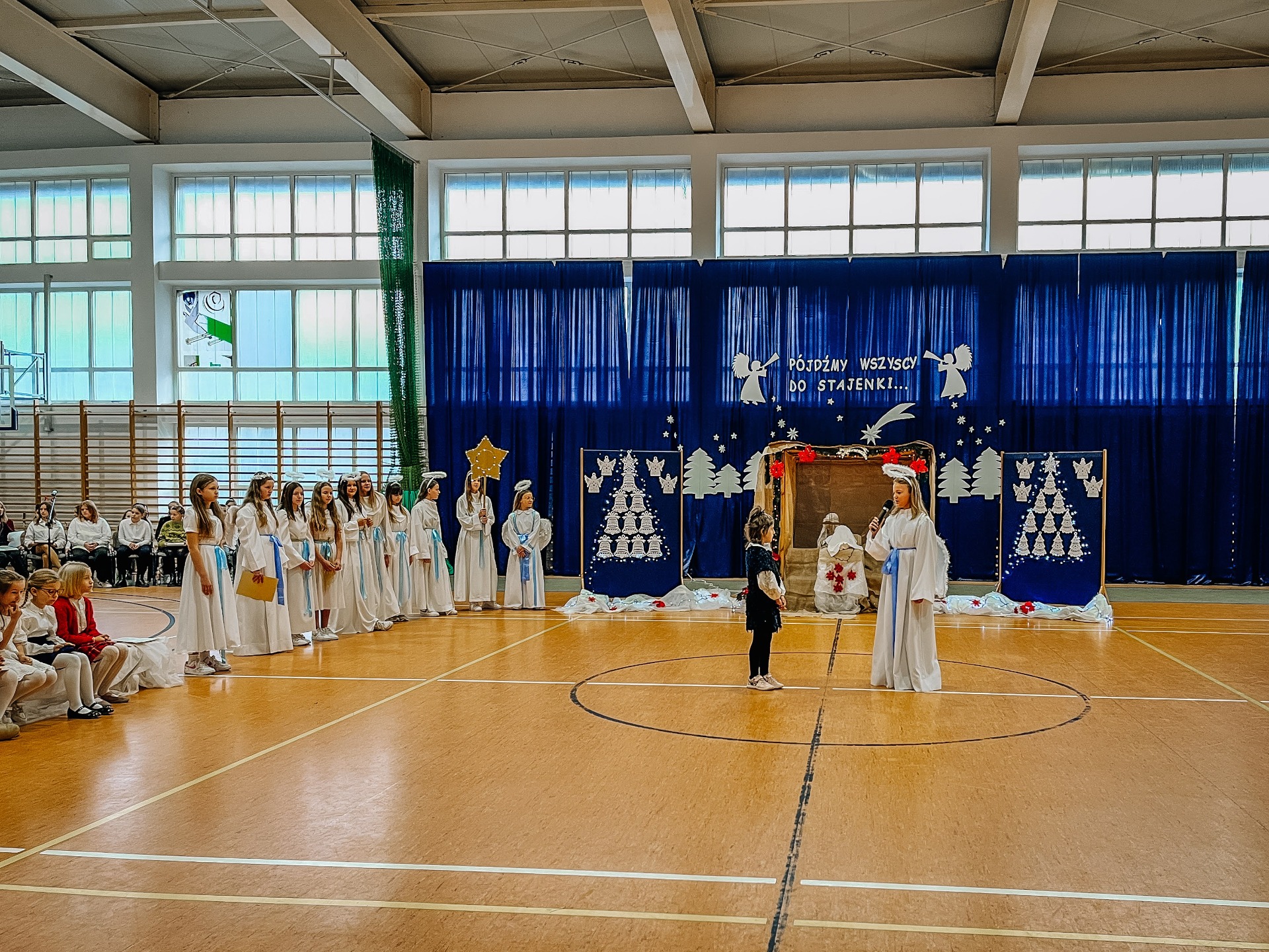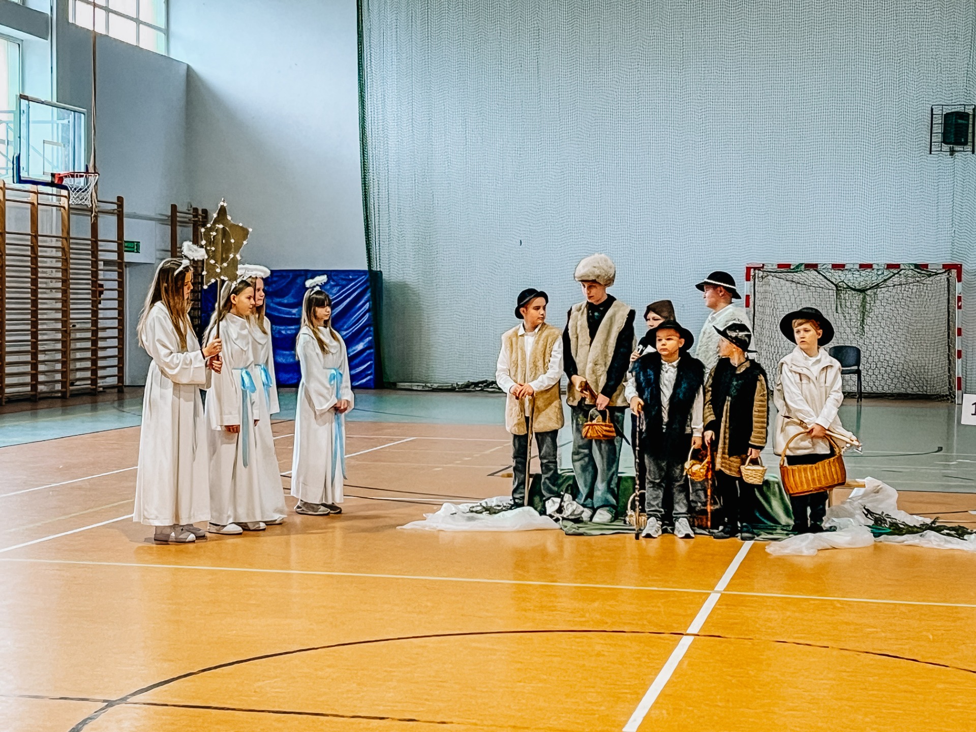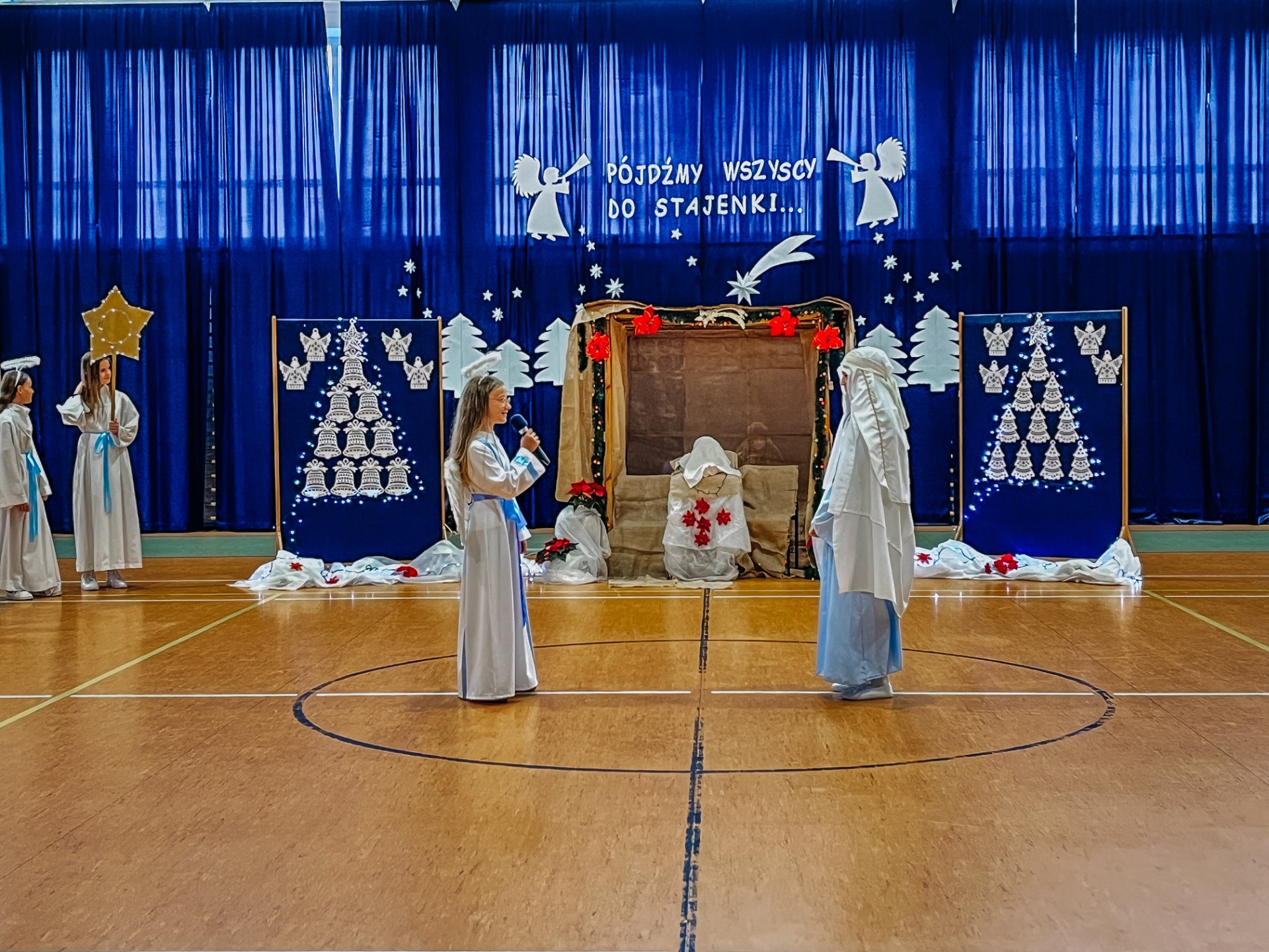 W dniu 20 grudnia 2024 roku o godzinie 9.00 na hali sportowej w naszej szkole odbyły się Jasełka w wykonaniu uczniów z klasy 1d i 6c oraz zespółu wokalnego dla całej społeczności szkolnej.