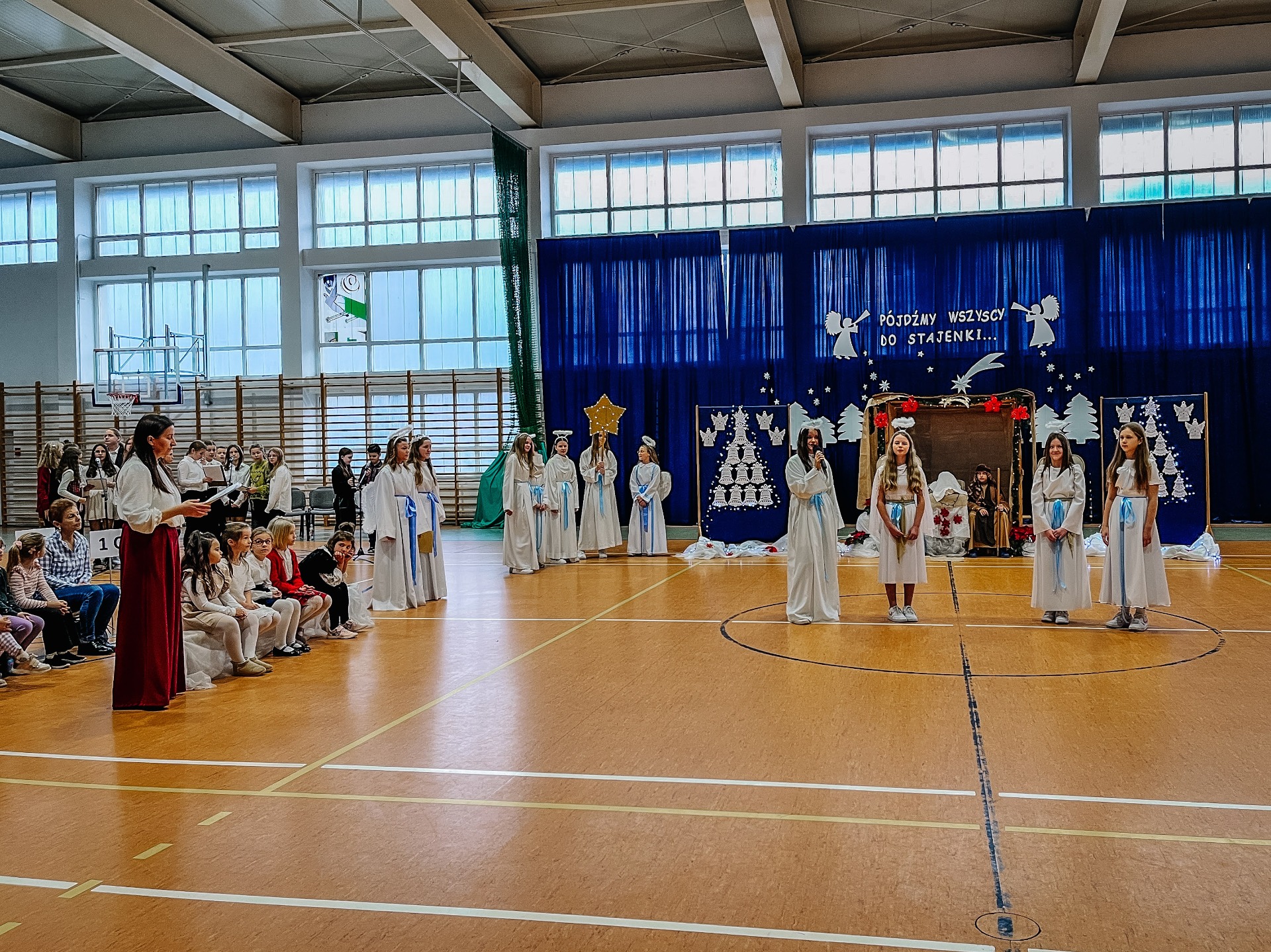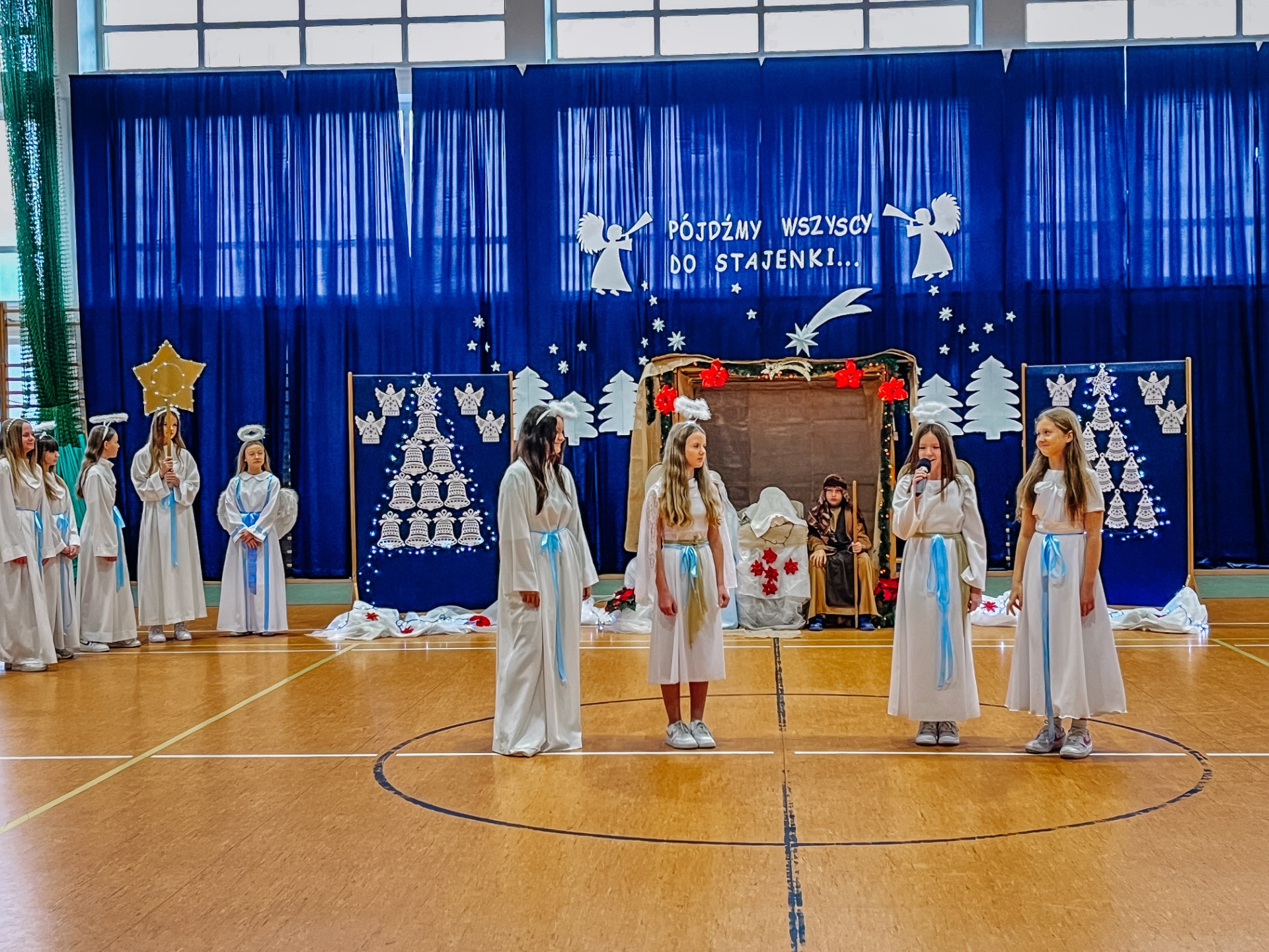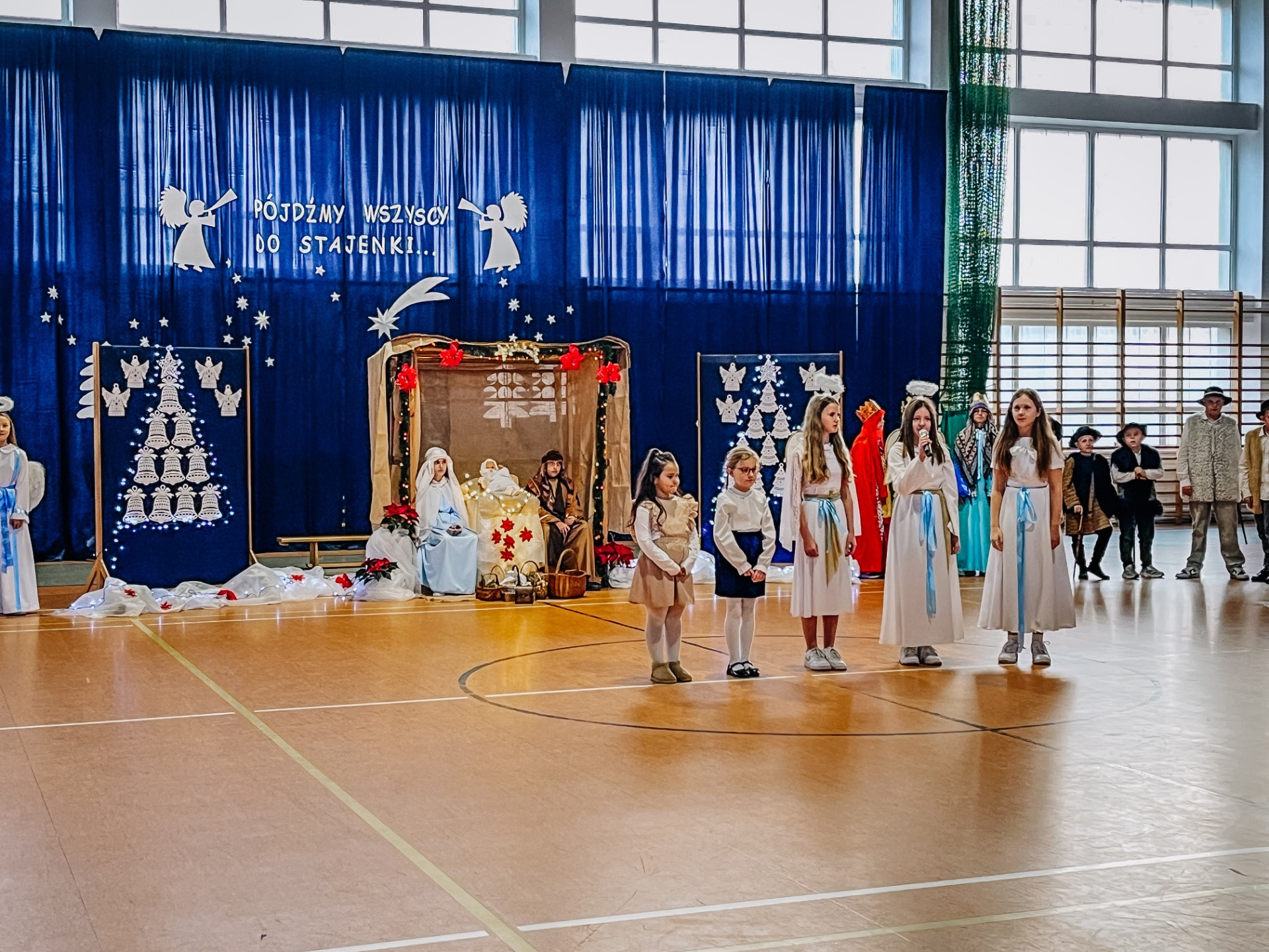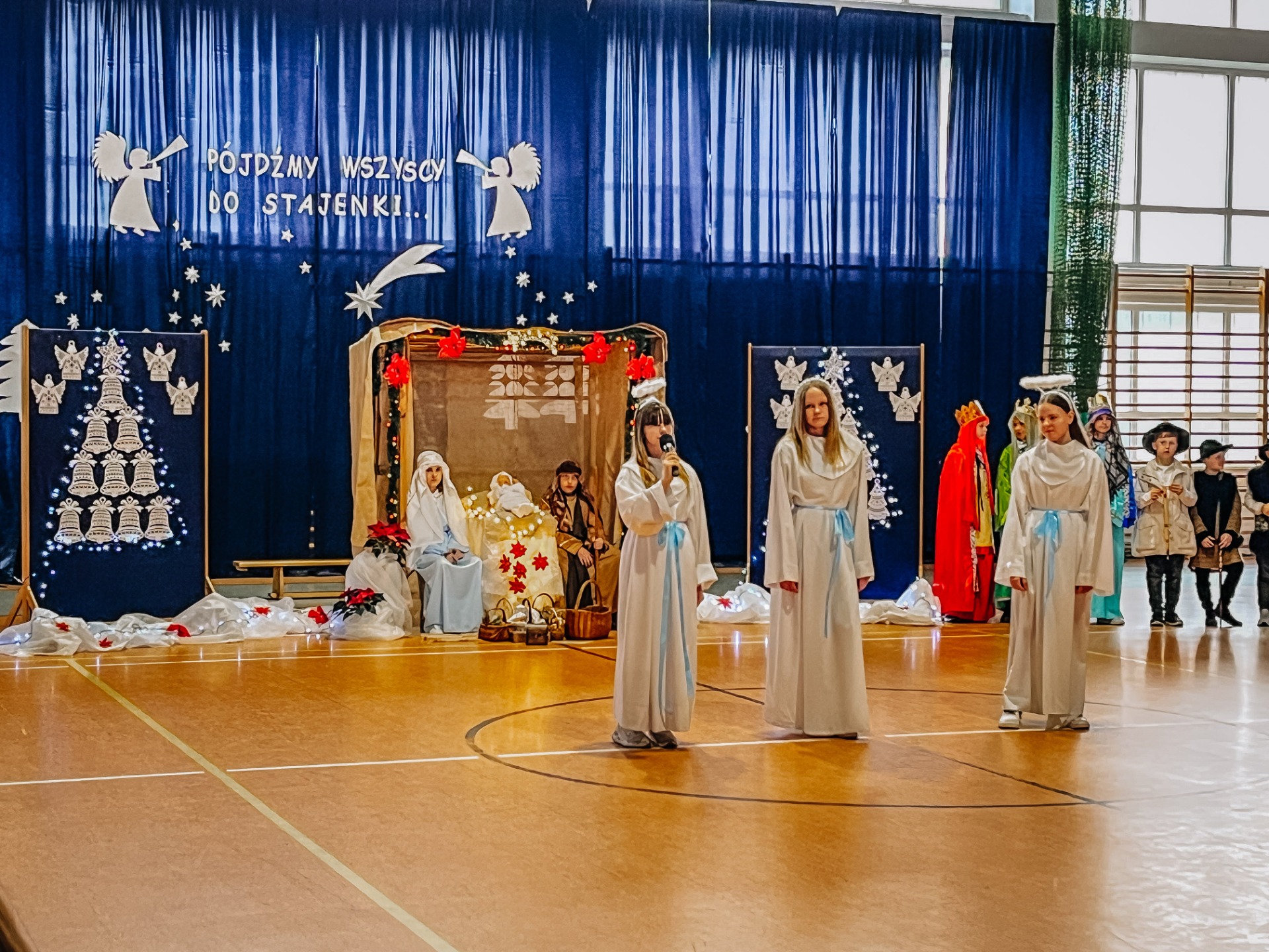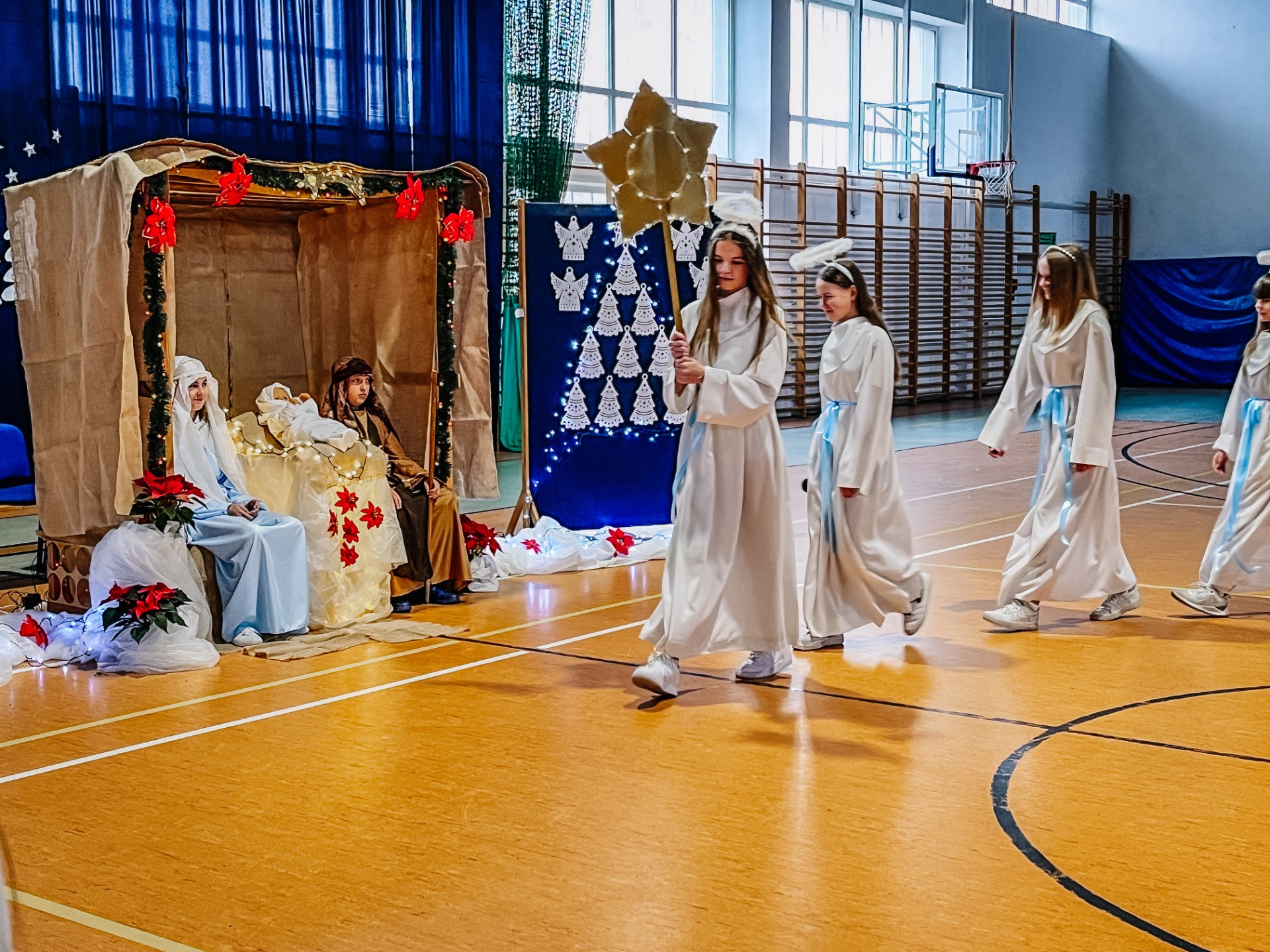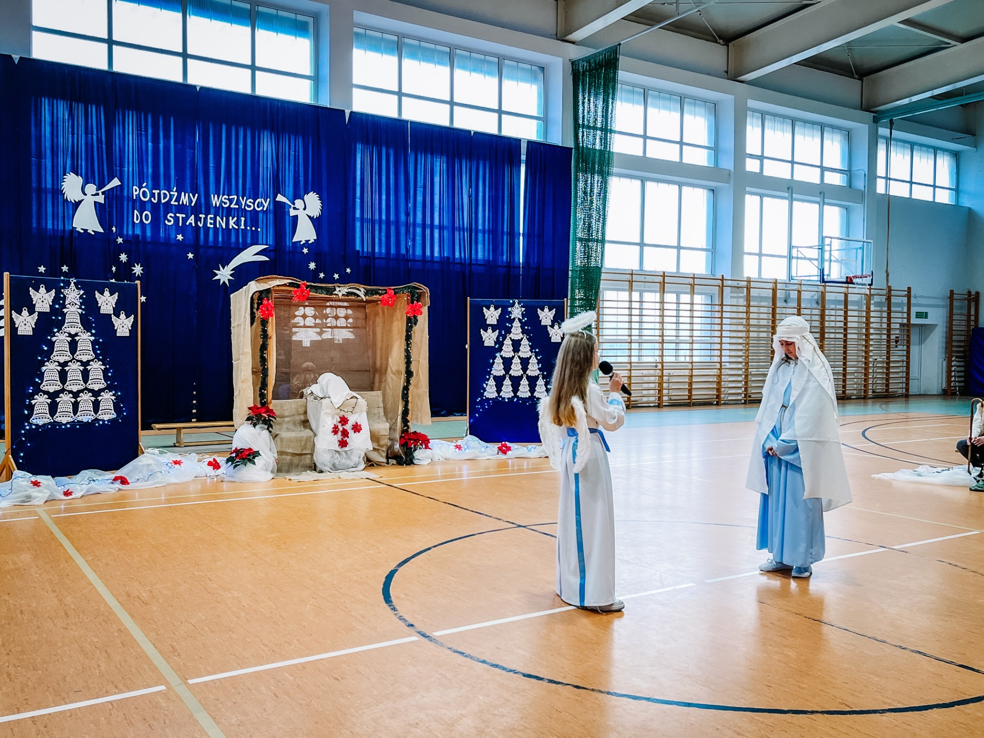 W dniu 20 grudnia 2024 roku o godzinie 9.00 na hali sportowej w naszej szkole odbyły się Jasełka w wykonaniu uczniów z klasy 1d i 6c oraz zespółu wokalnego dla całej społeczności szkolnej.