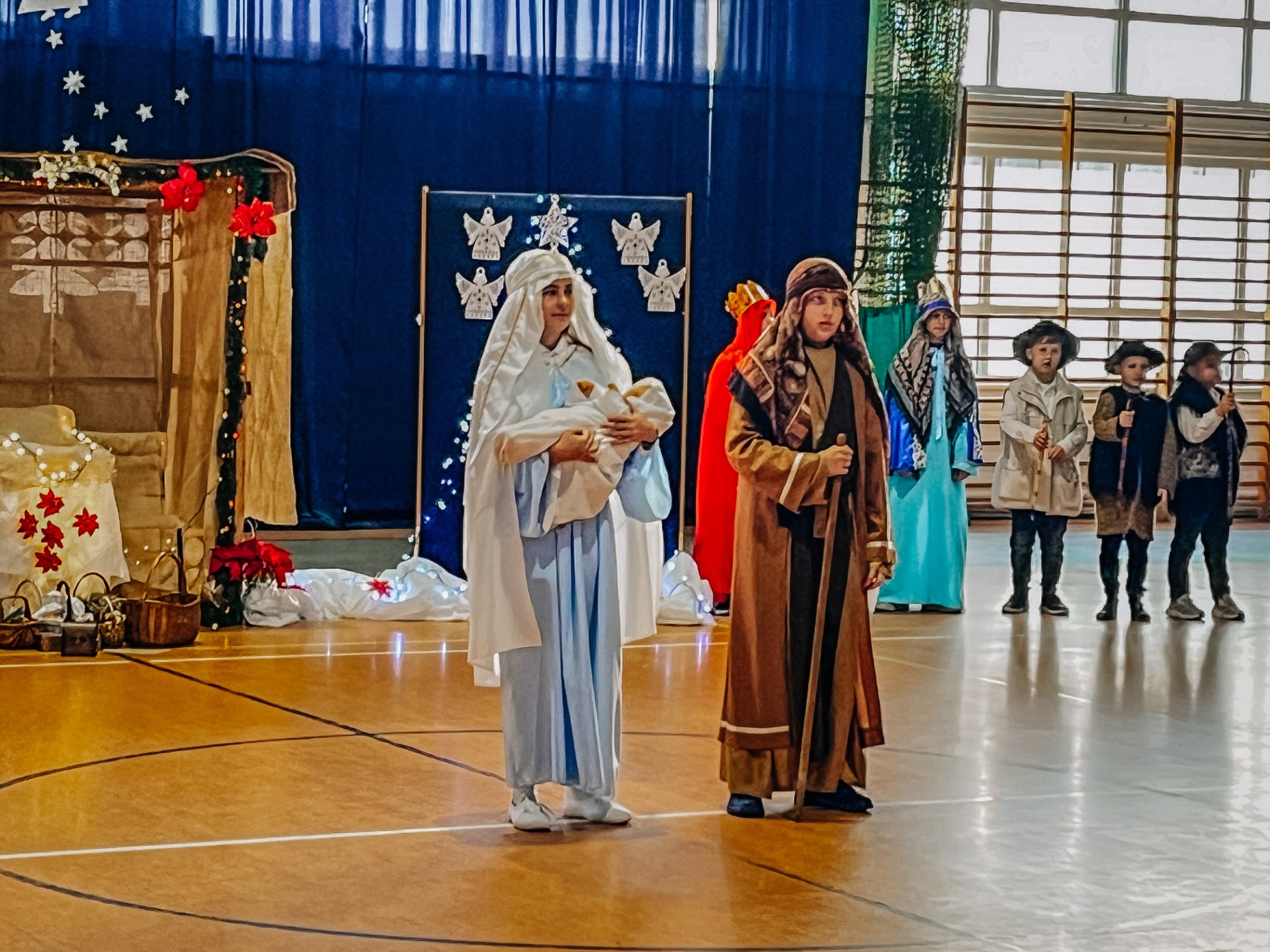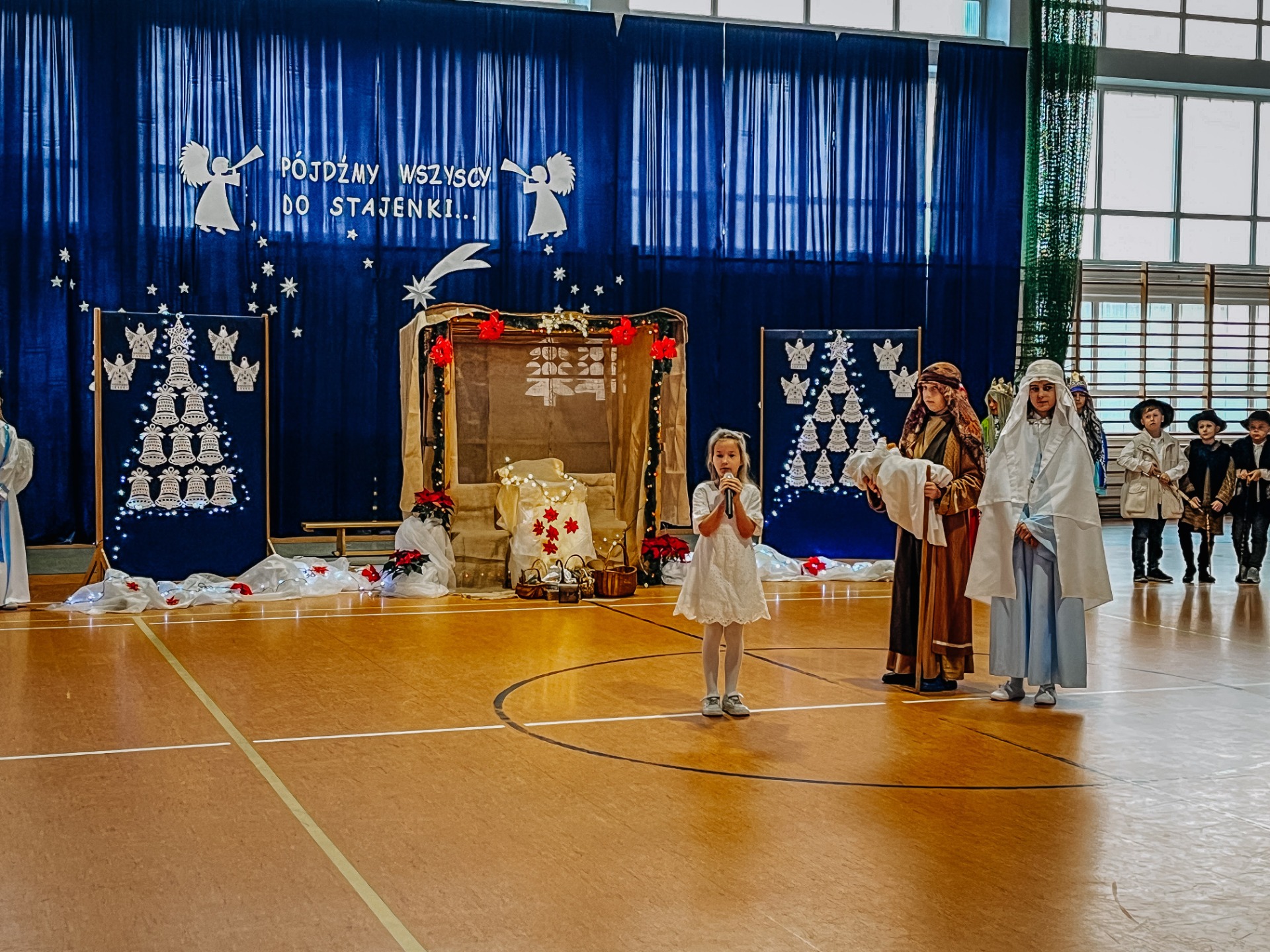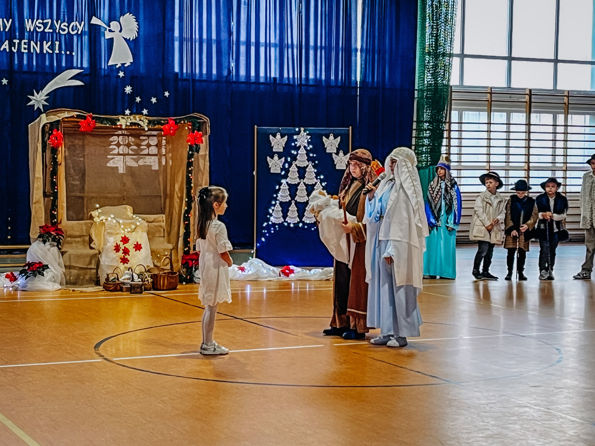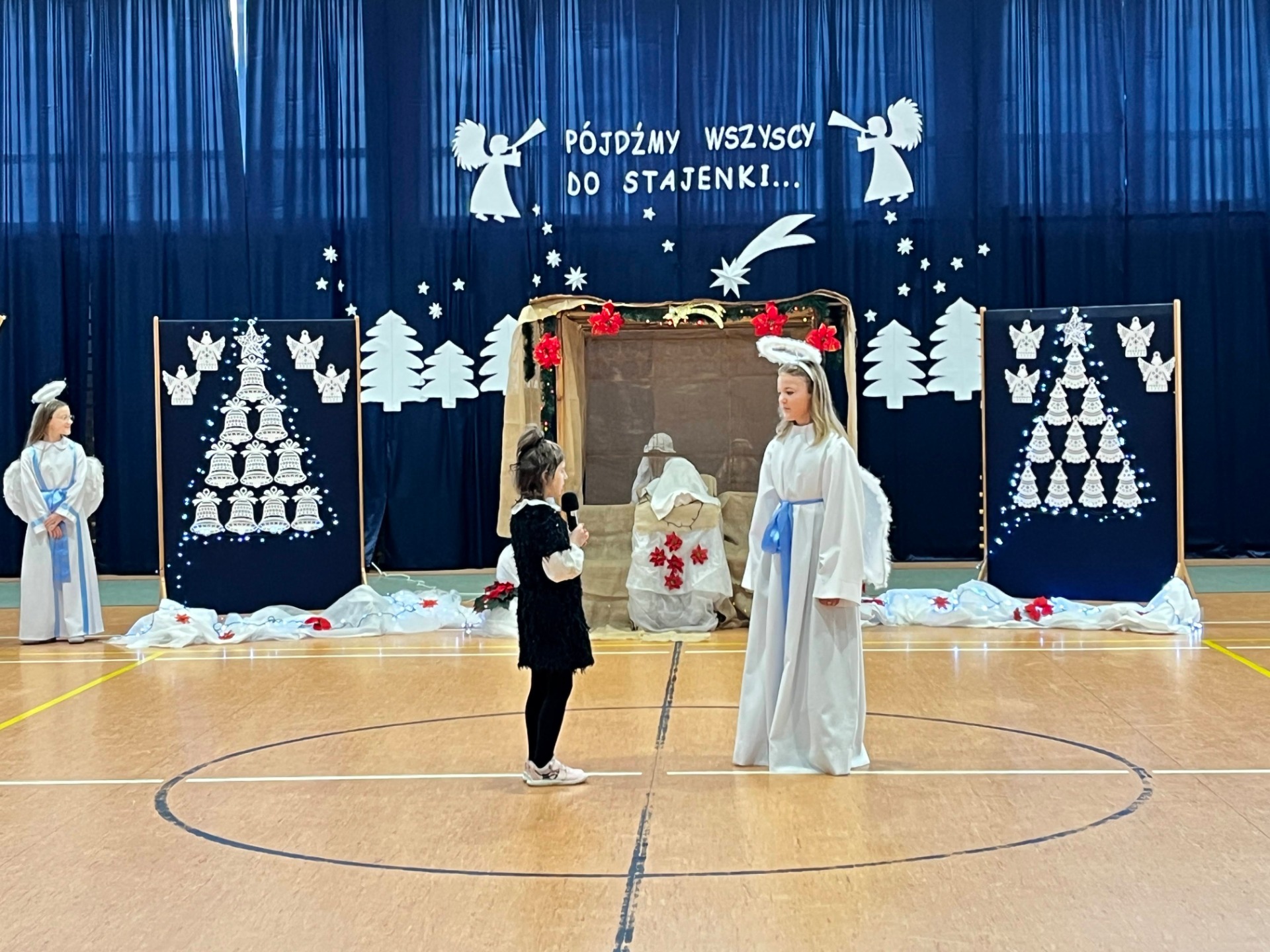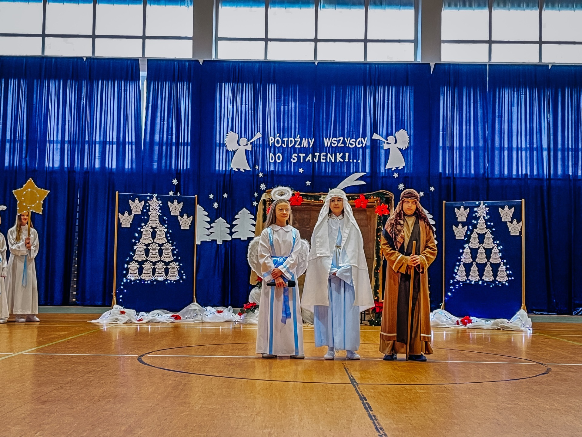 W dniu 20 grudnia 2024 roku o godzinie 9.00 na hali sportowej w naszej szkole odbyły się Jasełka w wykonaniu uczniów z klasy 1d i 6c oraz zespółu wokalnego dla całej społeczności szkolnej.