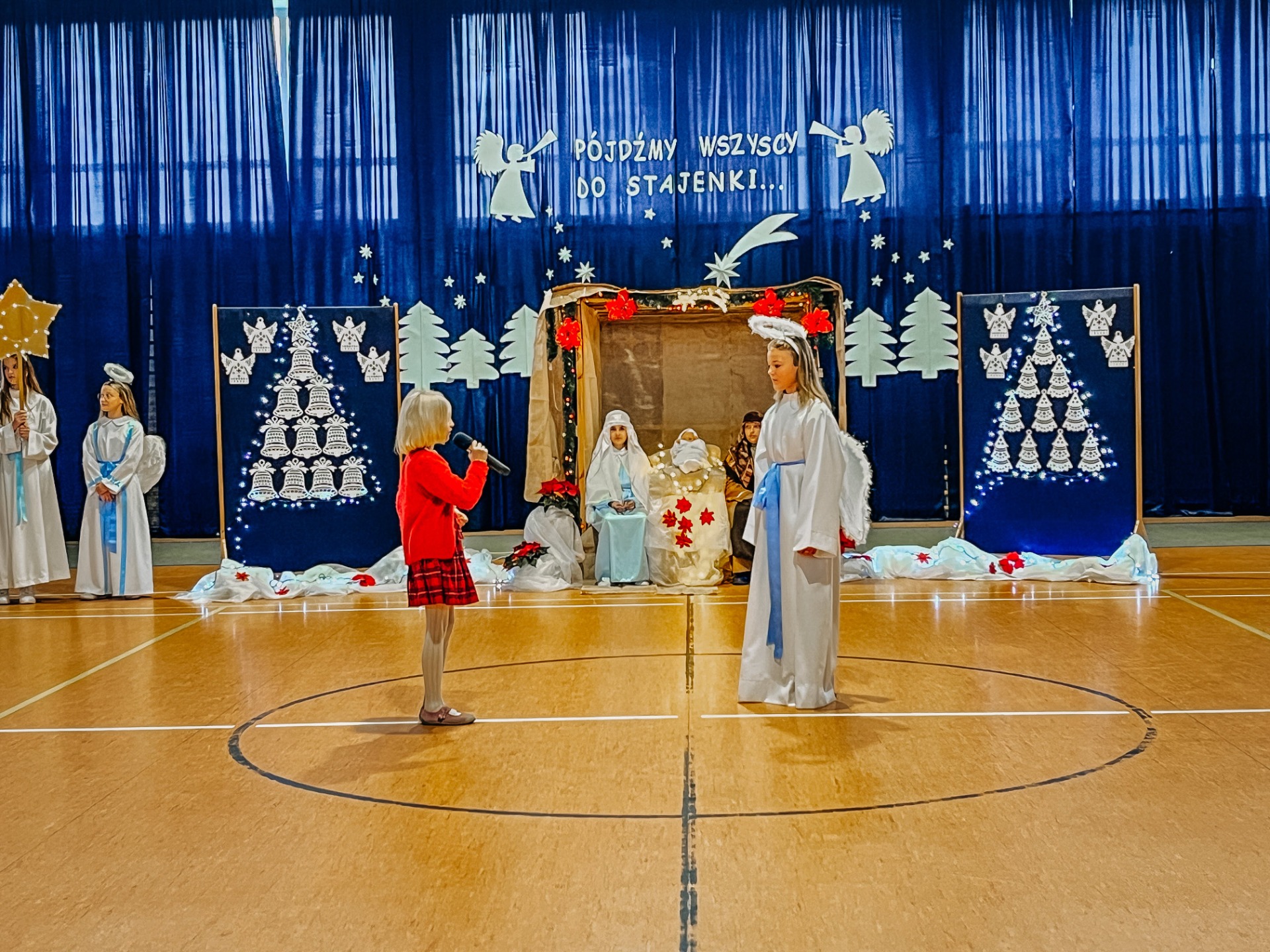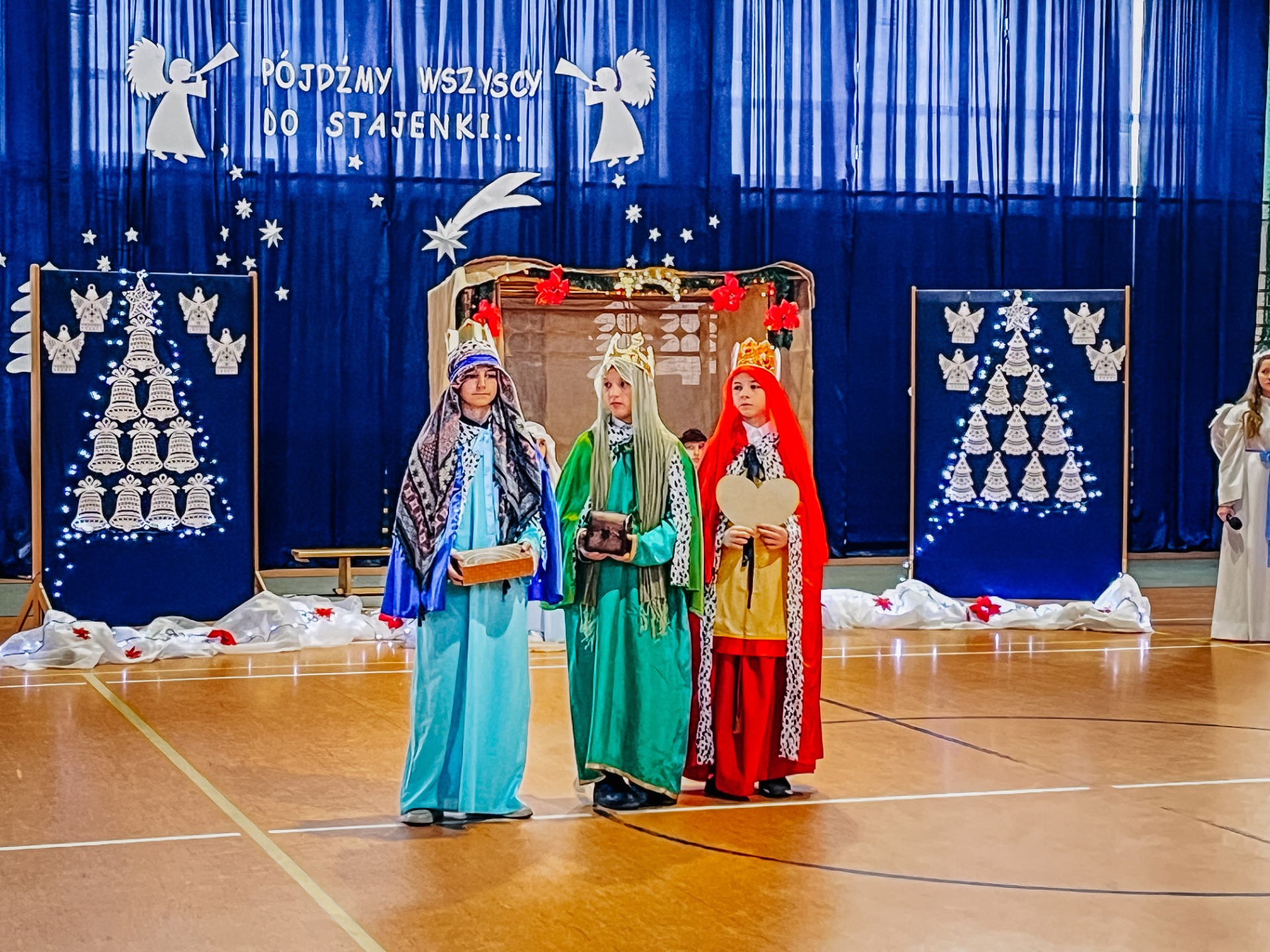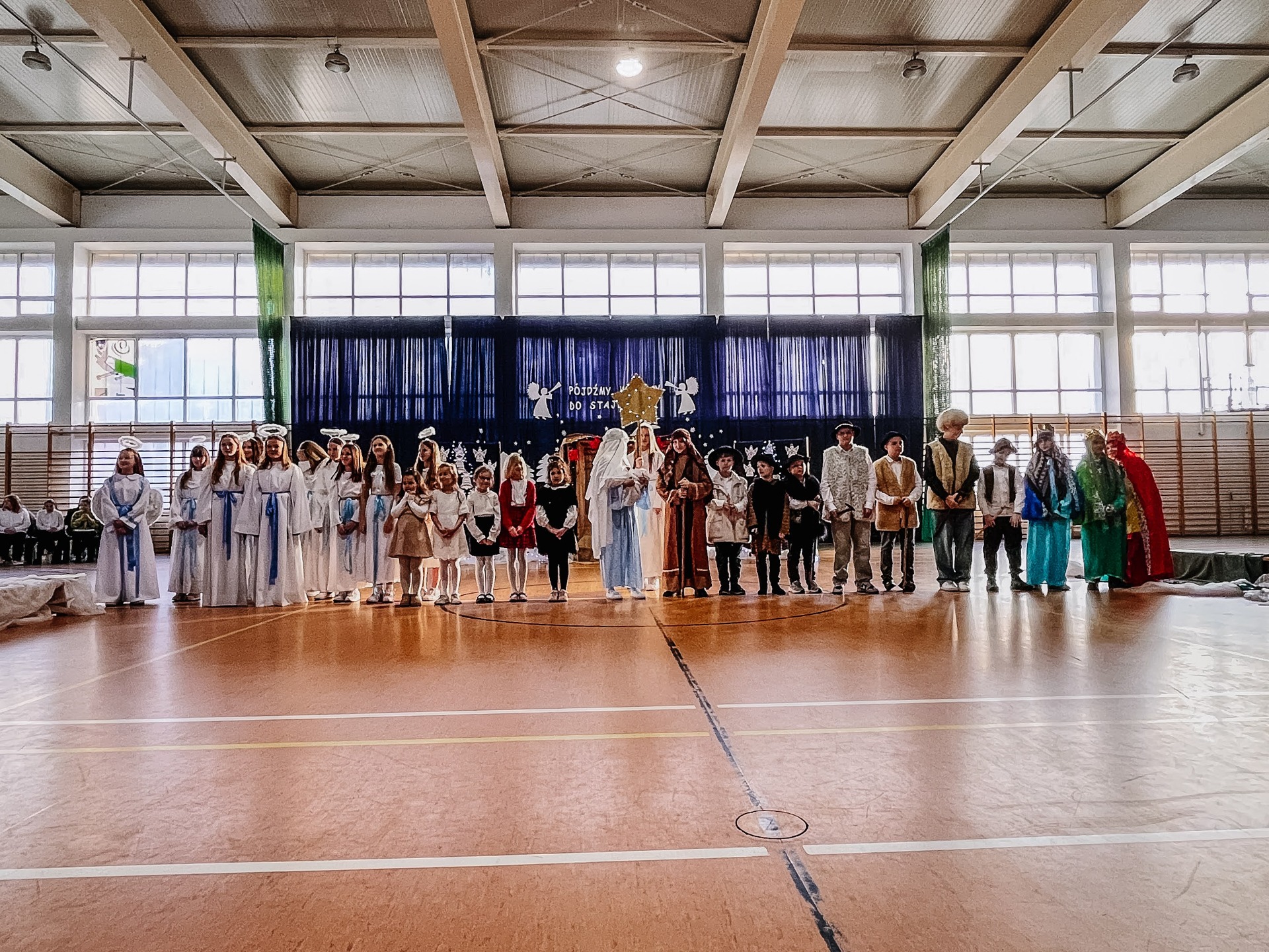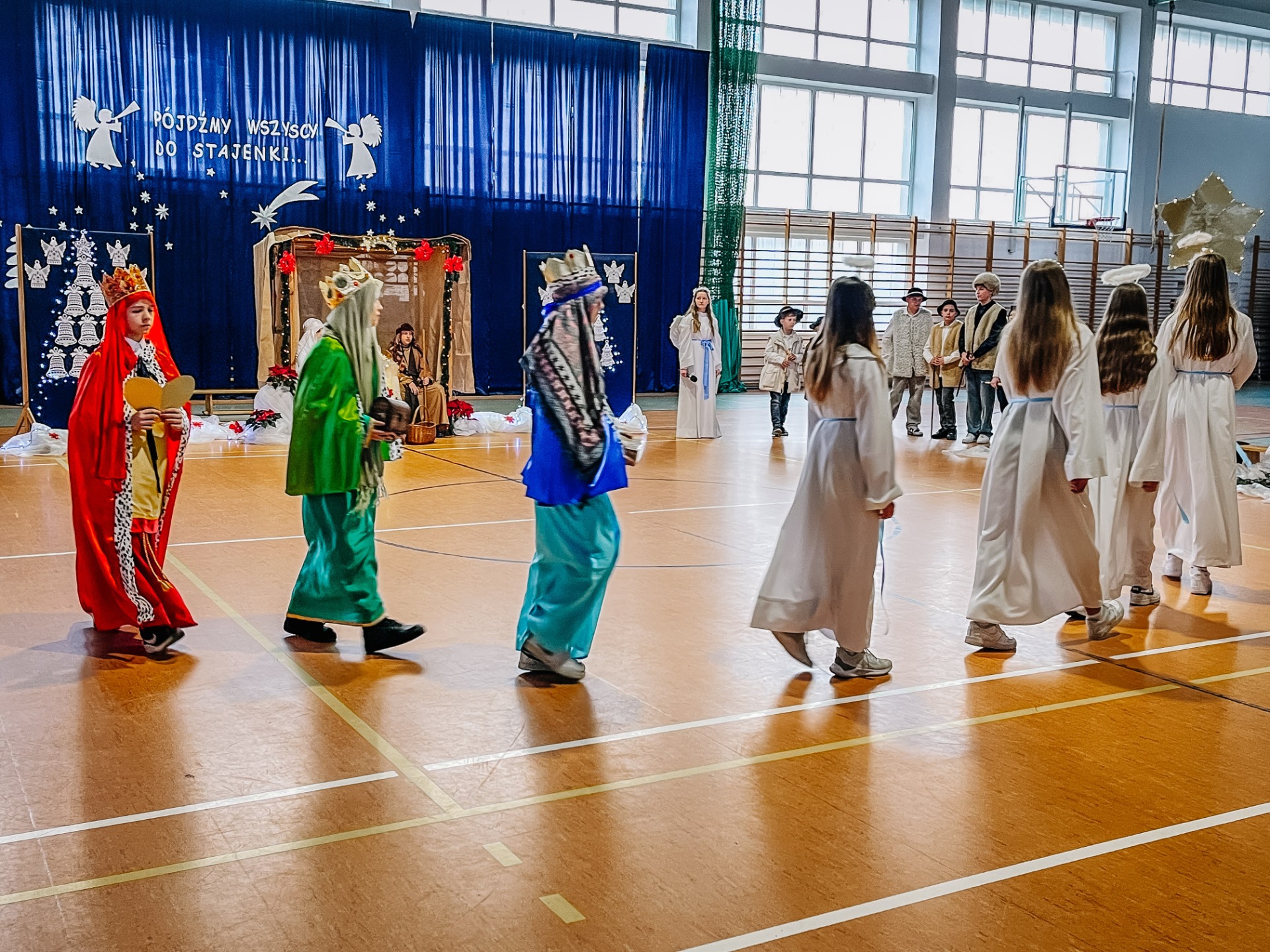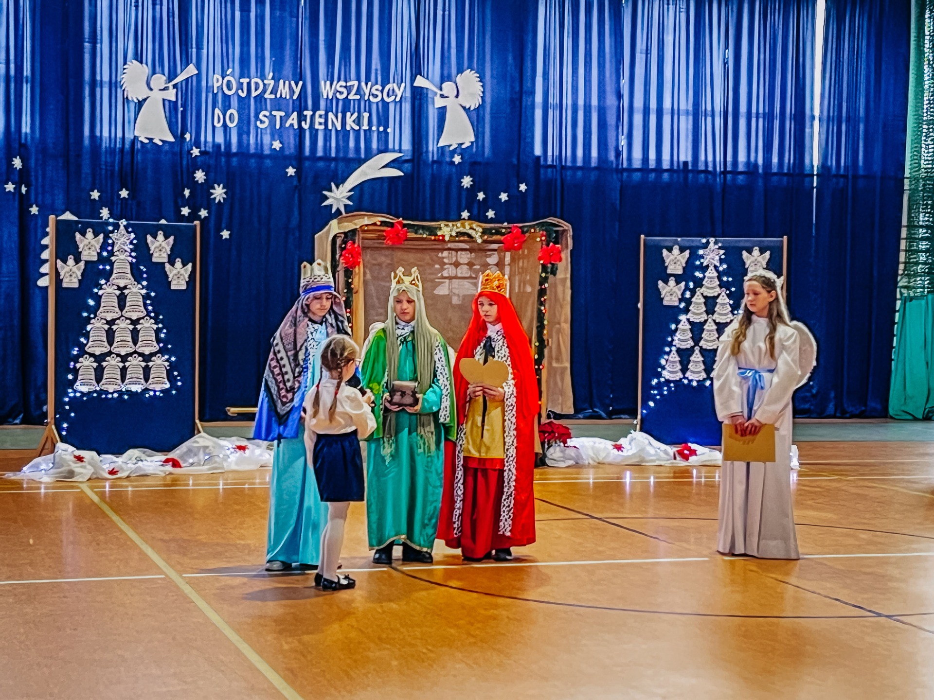 W dniu 20 grudnia 2024 roku o godzinie 9.00 na hali sportowej w naszej szkole odbyły się Jasełka w wykonaniu uczniów z klasy 1d i 6c oraz zespółu wokalnego dla całej społeczności szkolnej.