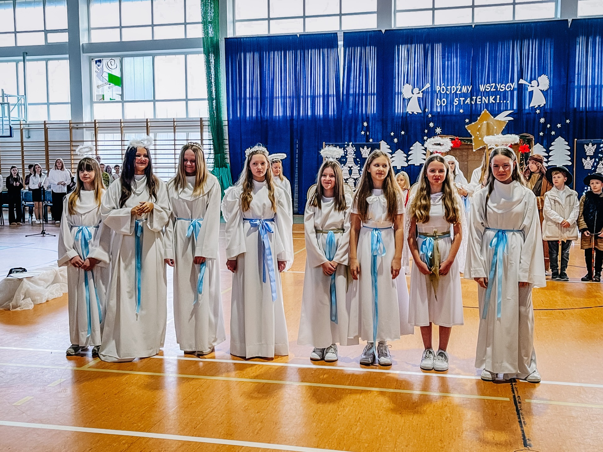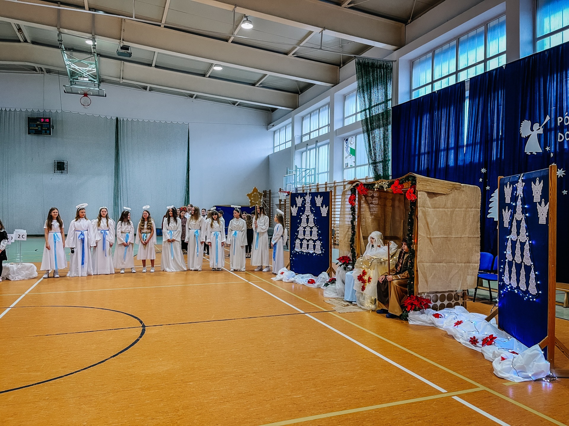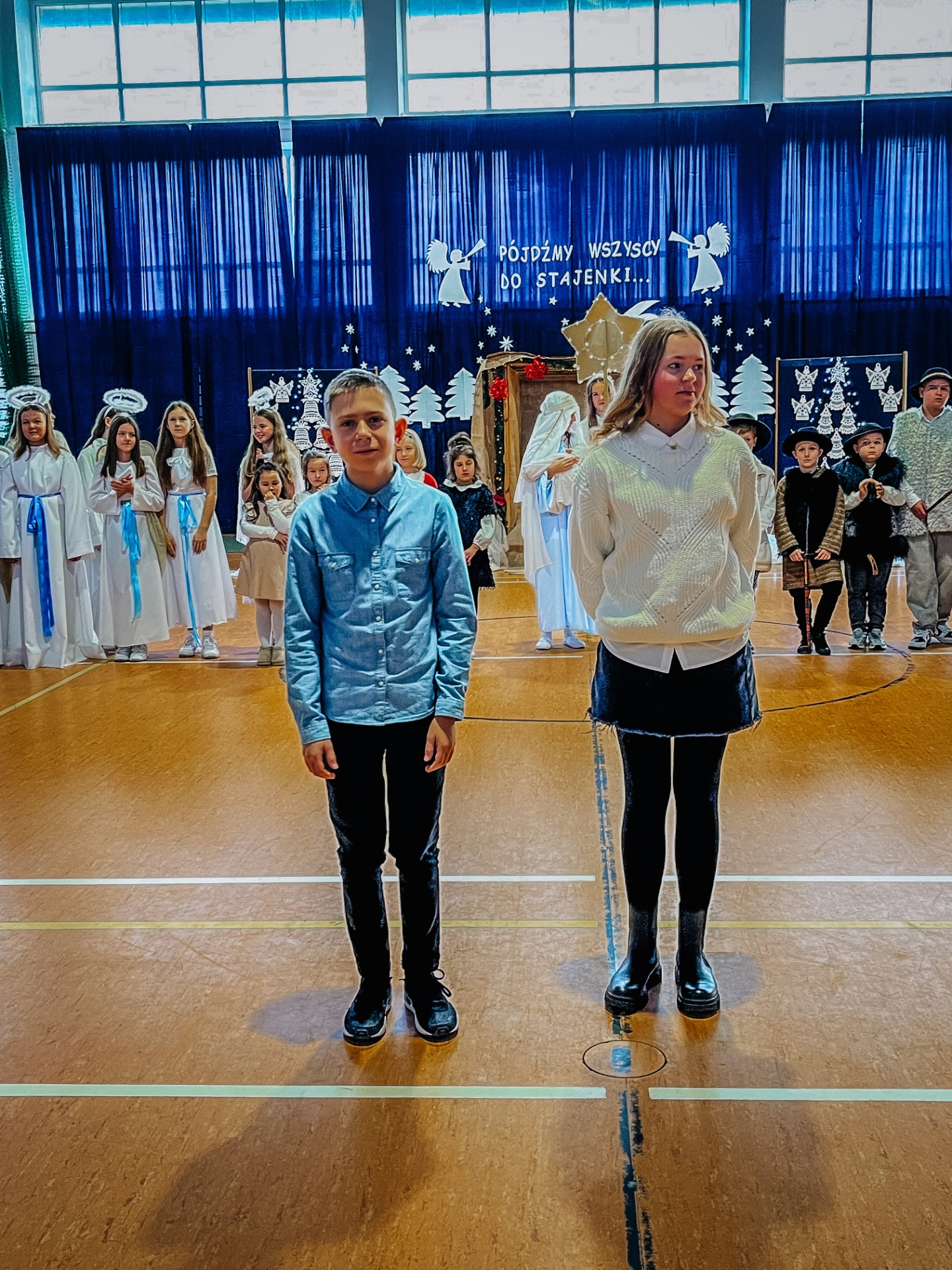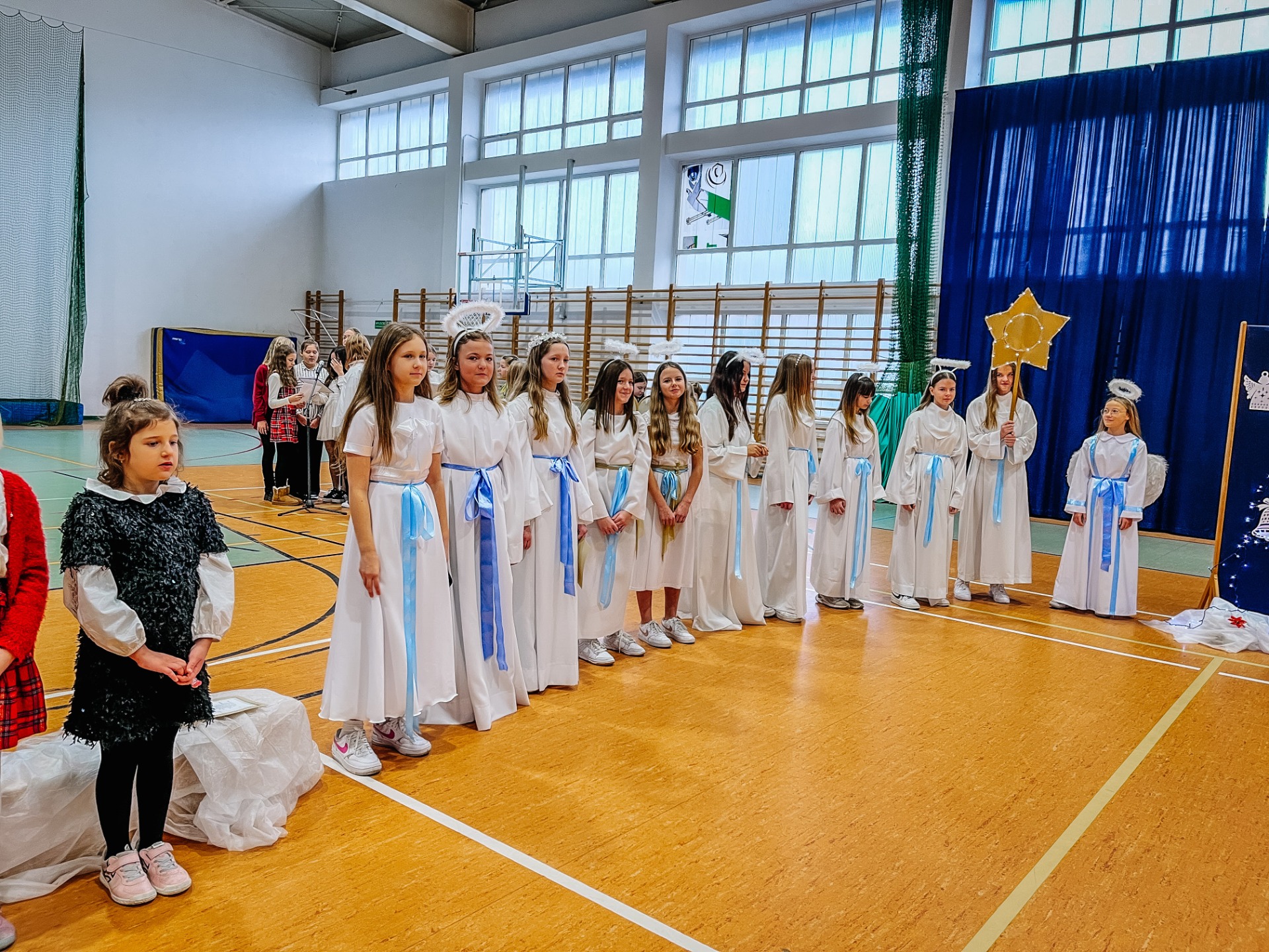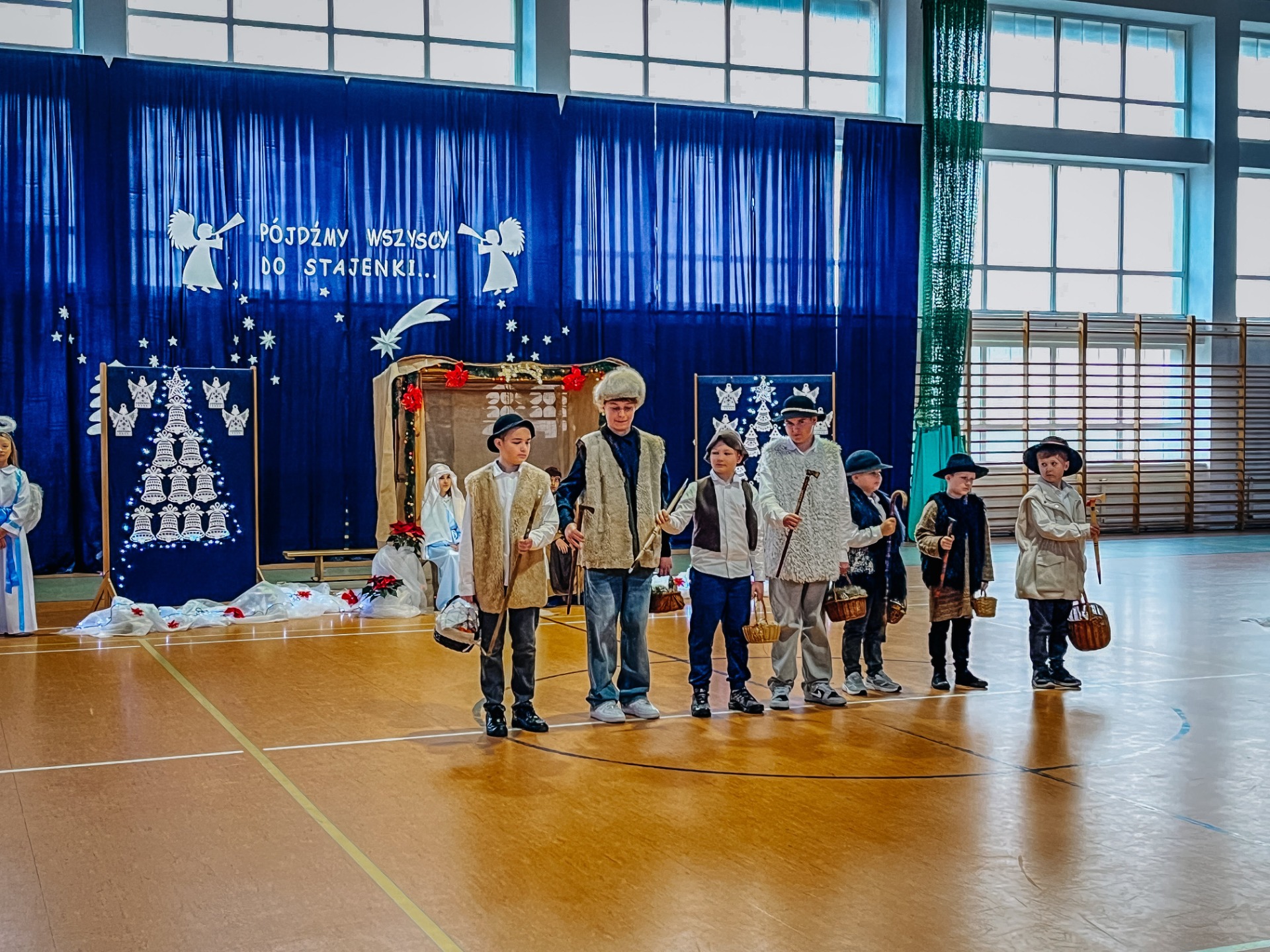 W dniu 20 grudnia 2024 roku o godzinie 9.00 na hali sportowej w naszej szkole odbyły się Jasełka w wykonaniu uczniów z klasy 1d i 6c oraz zespółu wokalnego dla całej społeczności szkolnej.