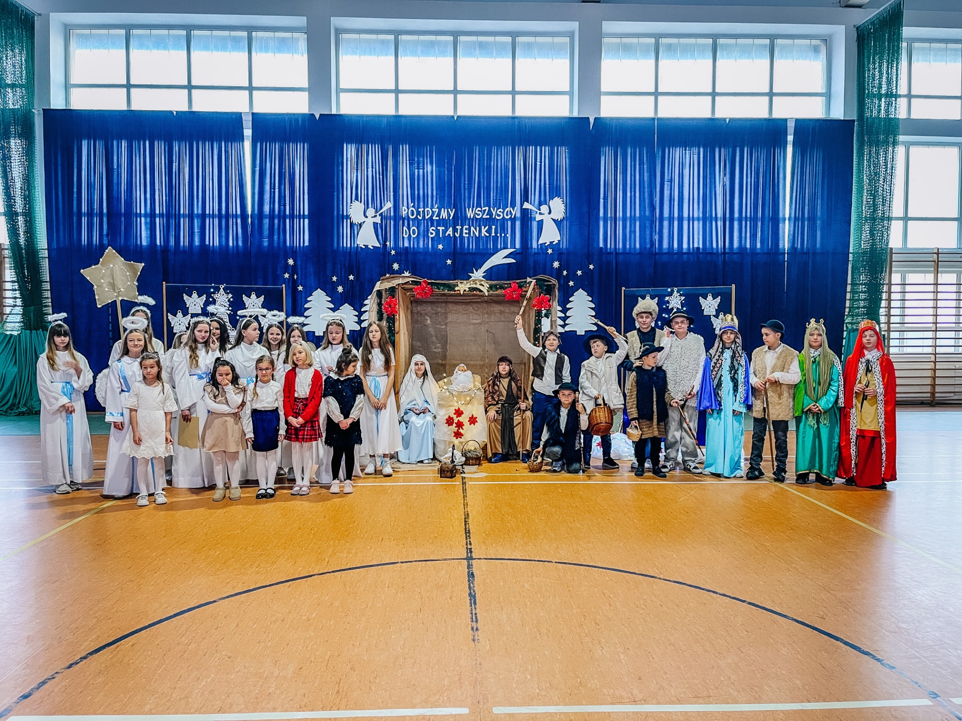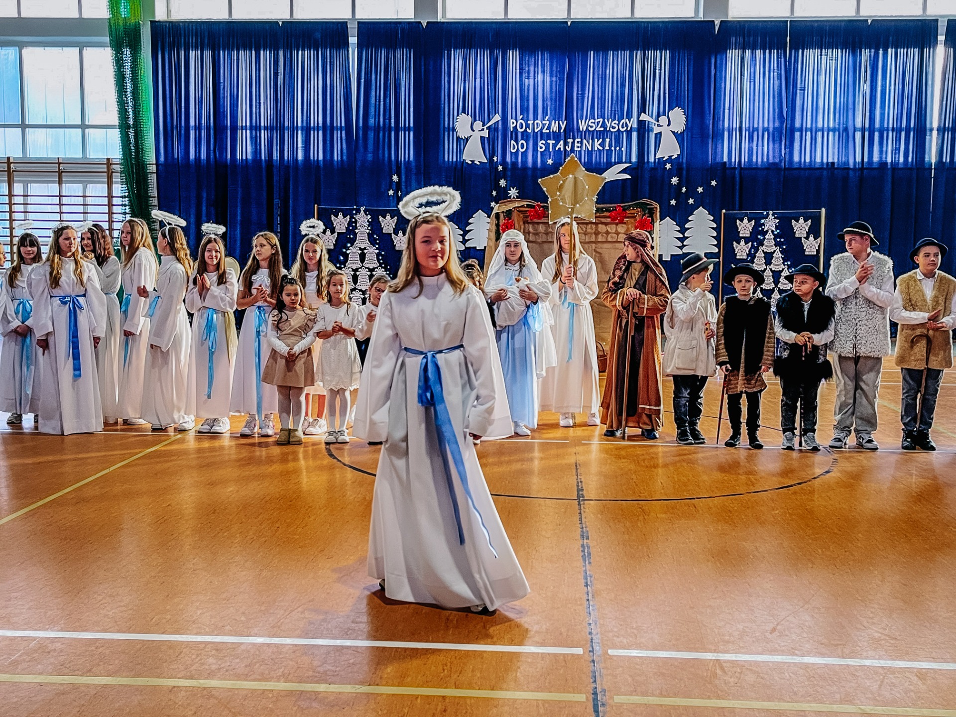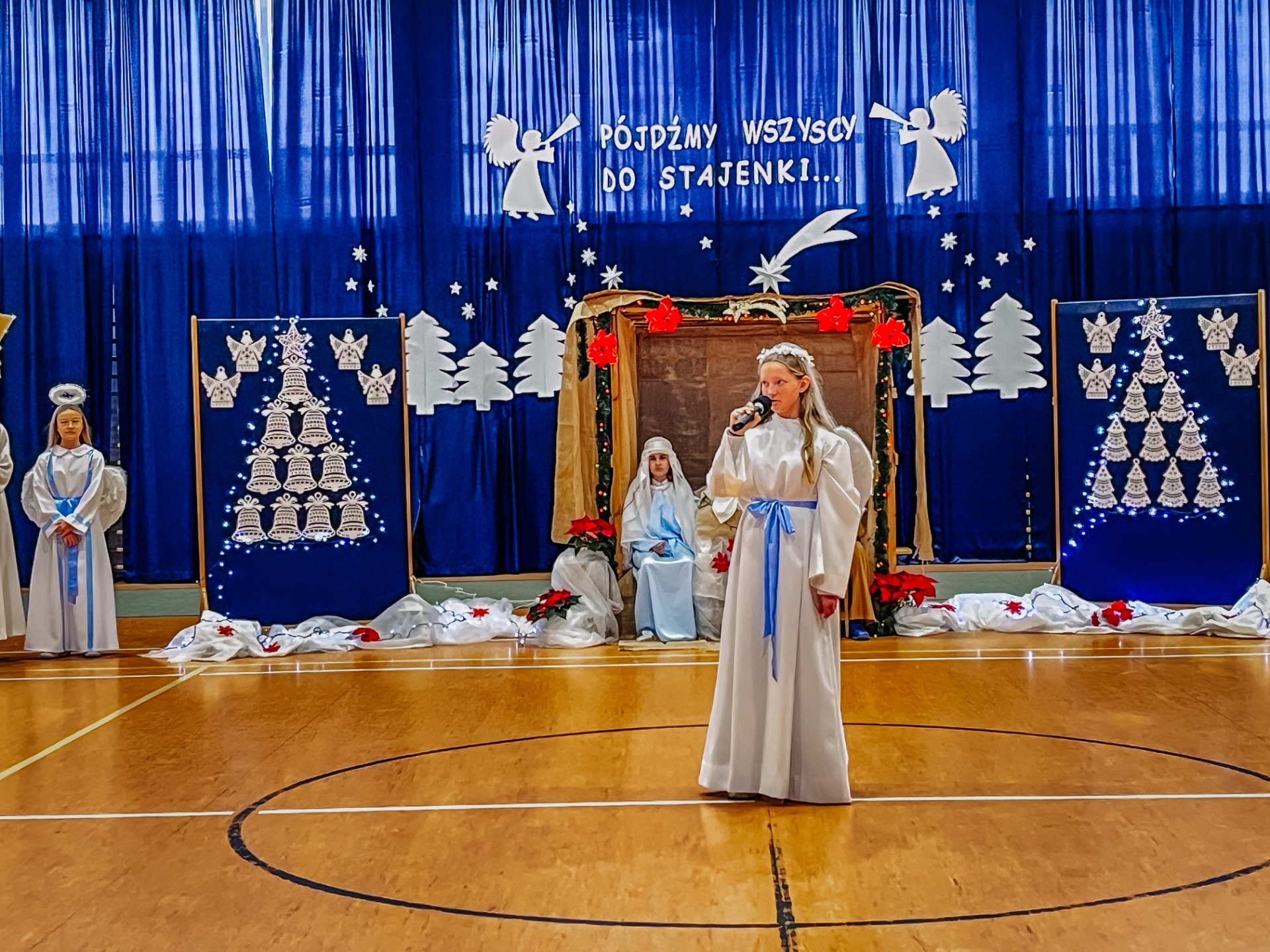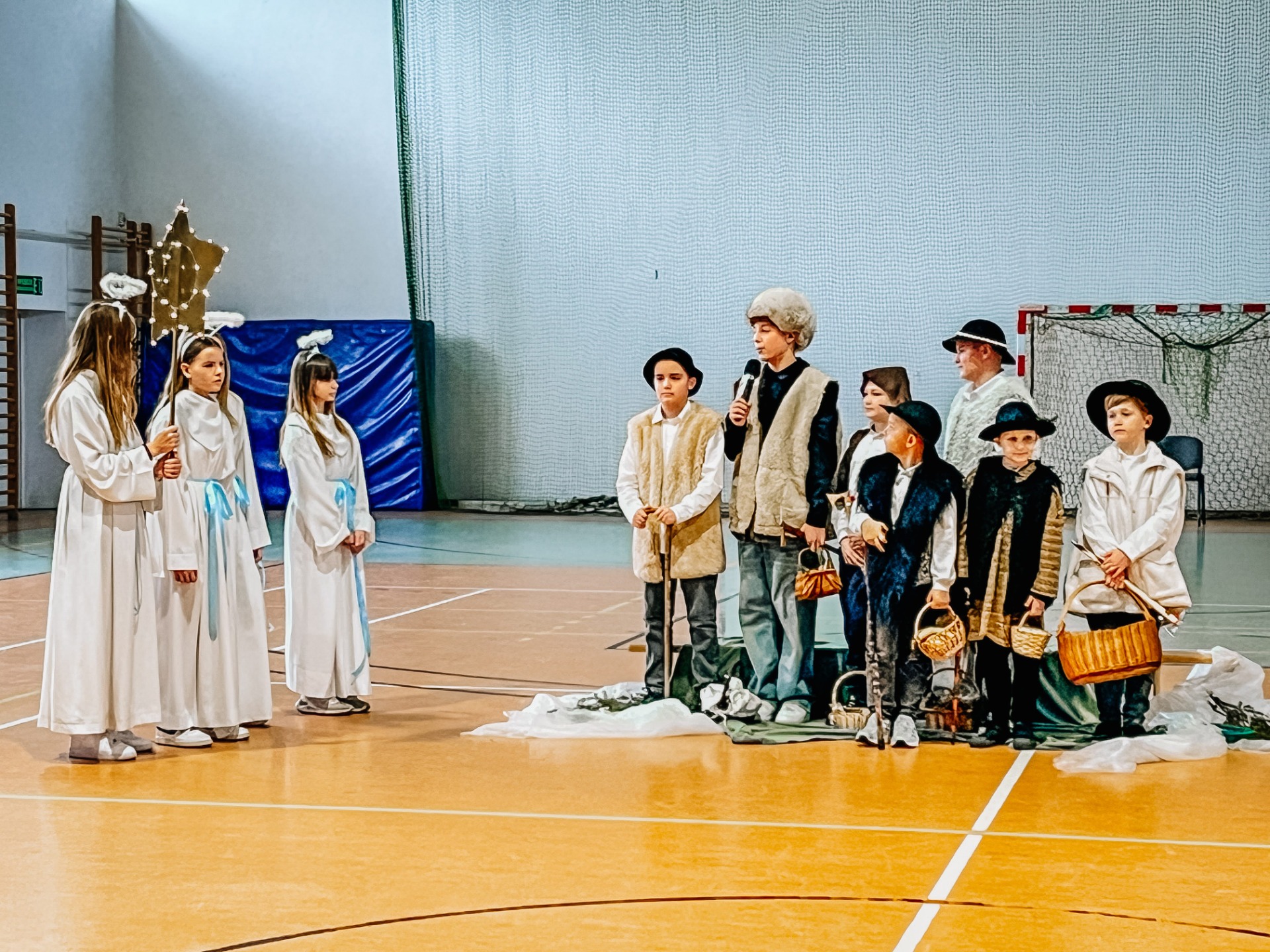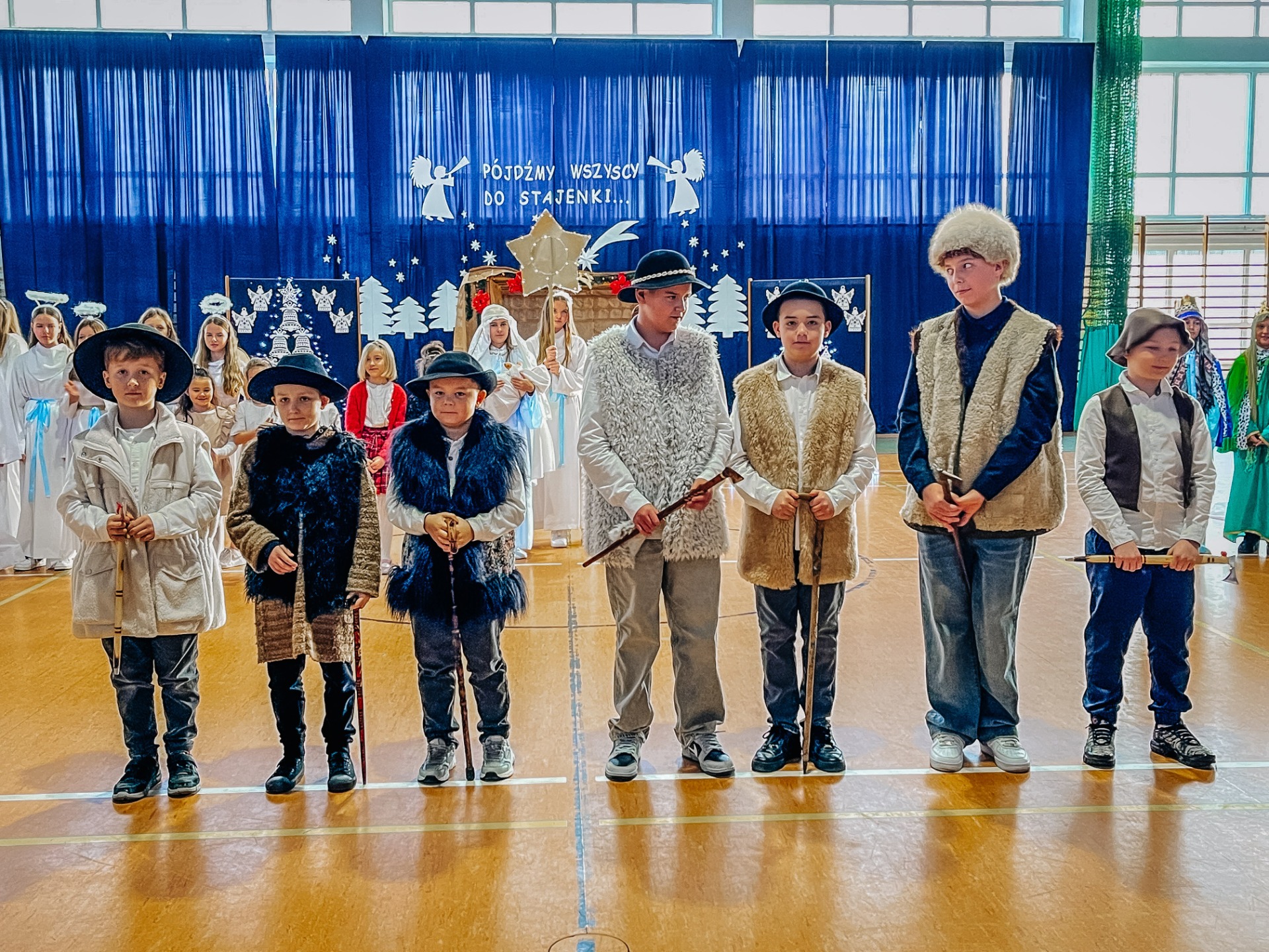 W dniu 20 grudnia 2024 roku o godzinie 9.00 na hali sportowej w naszej szkole odbyły się Jasełka w wykonaniu uczniów z klasy 1d i 6c oraz zespółu wokalnego dla całej społeczności szkolnej.