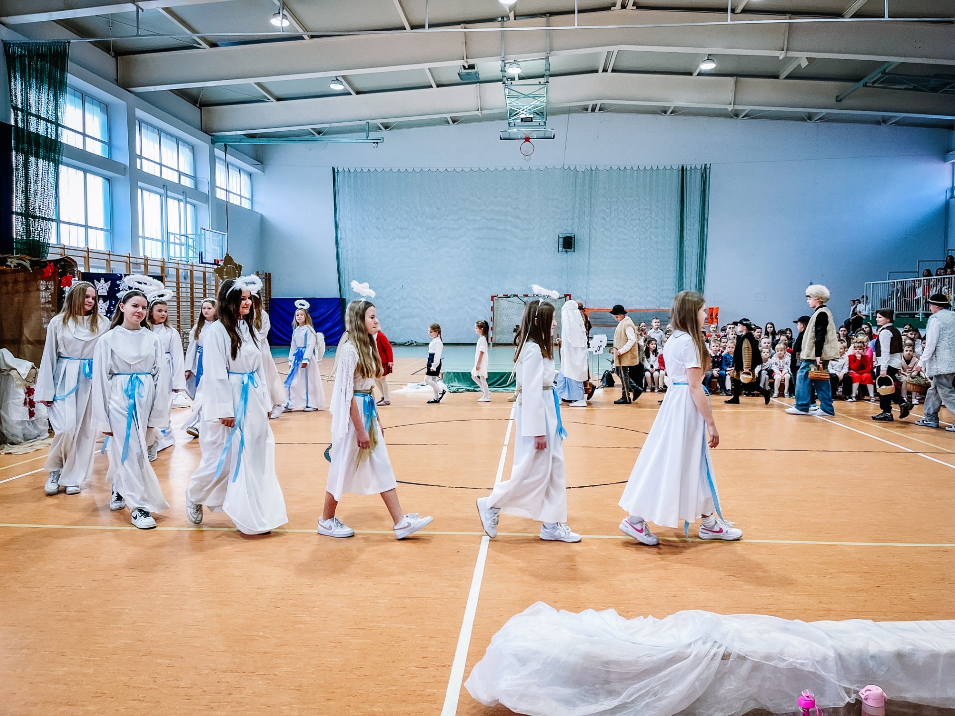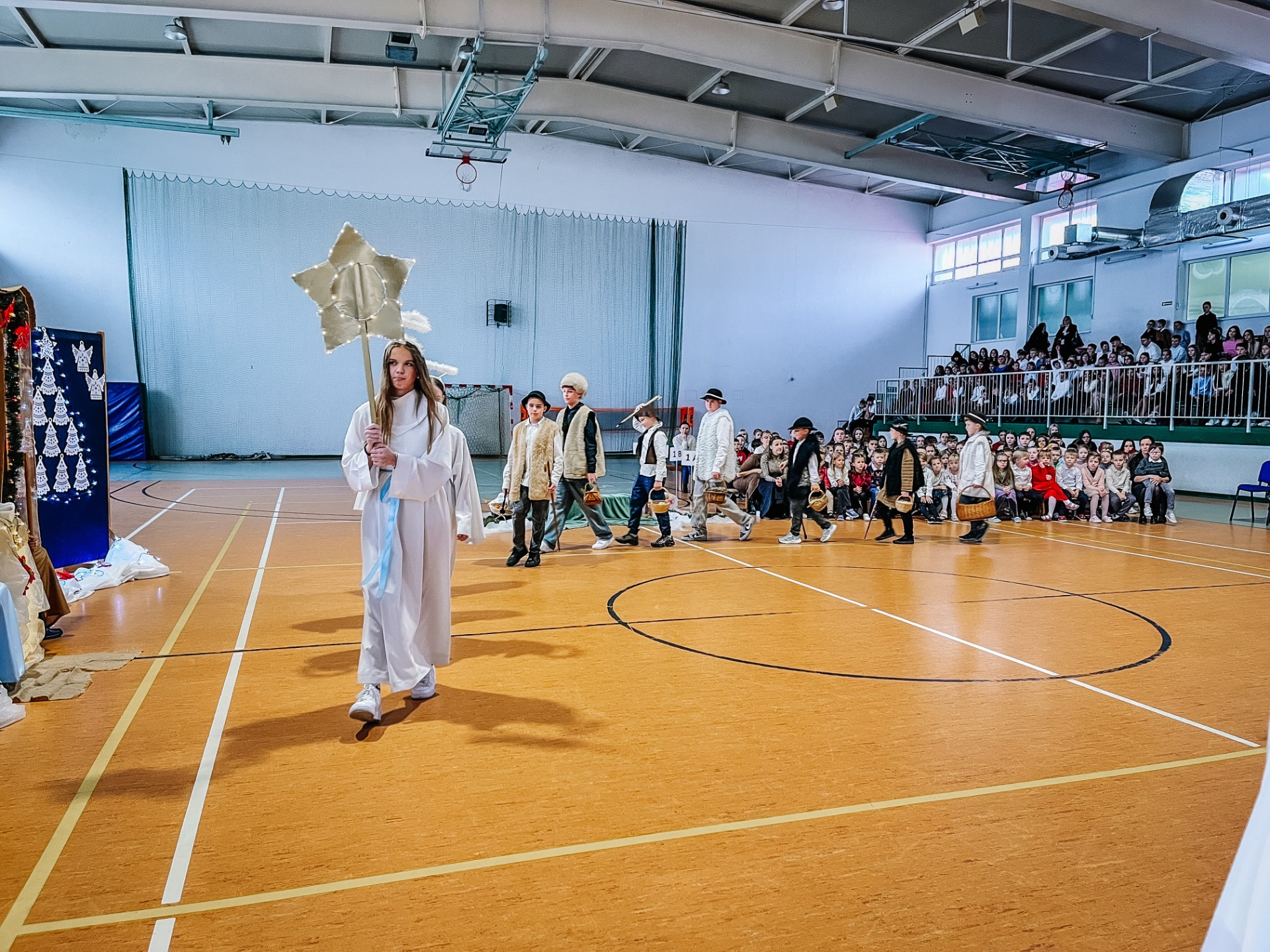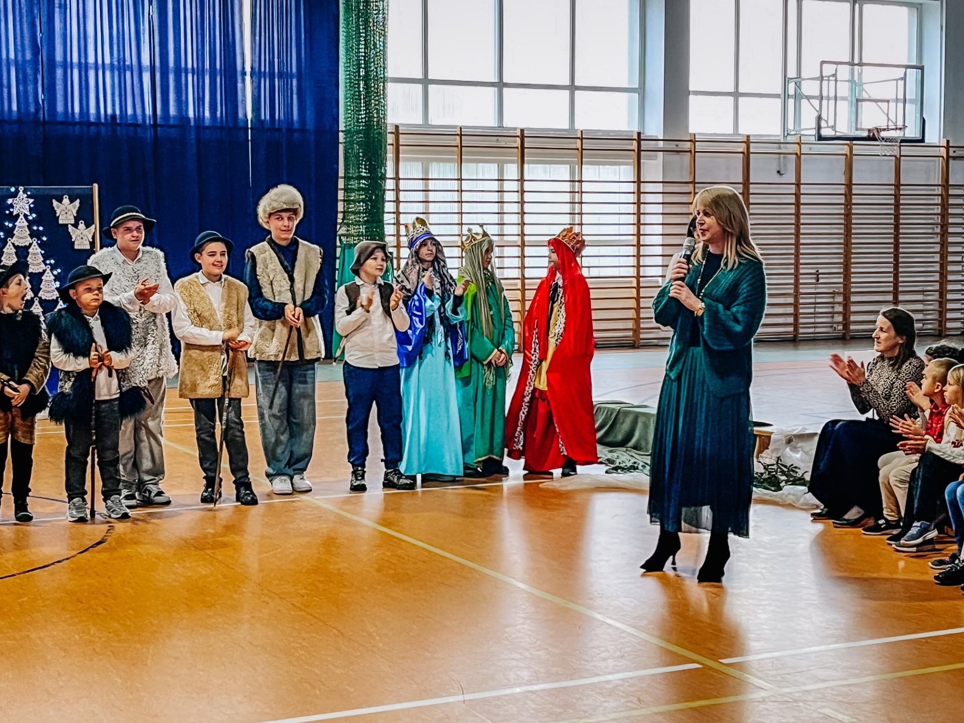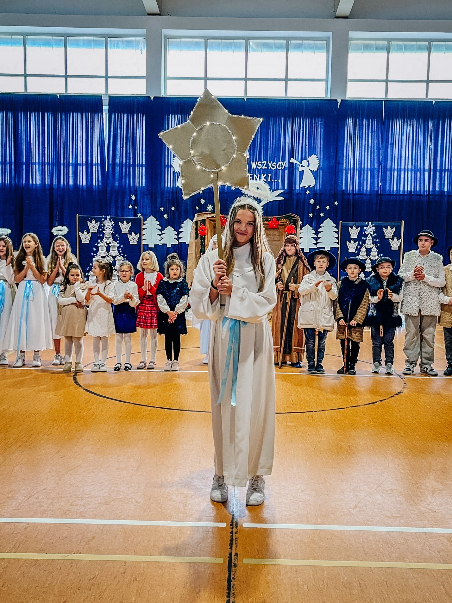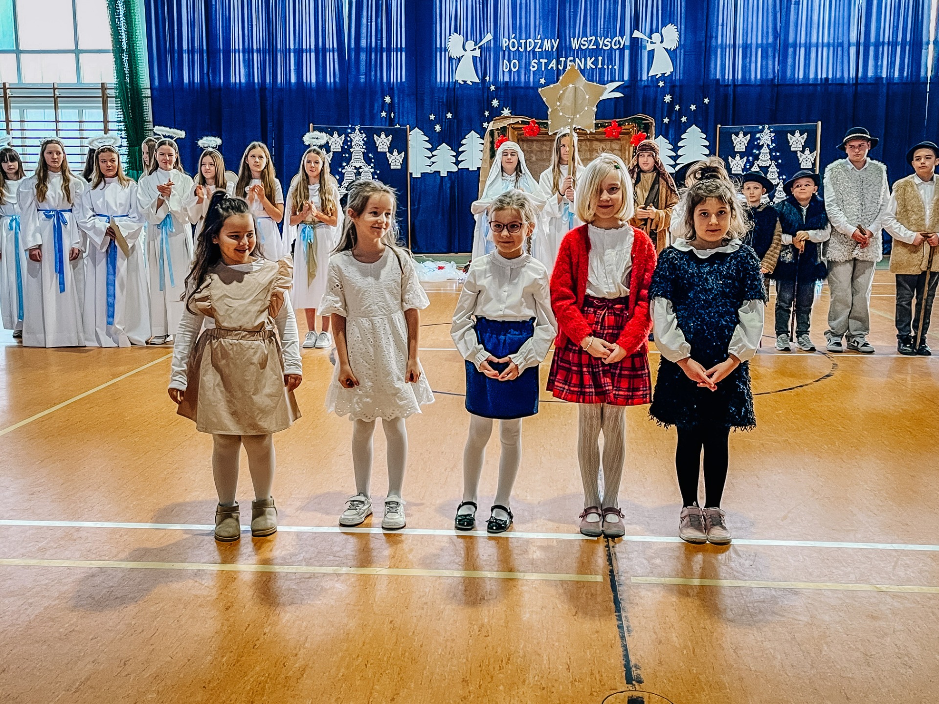 W dniu 20 grudnia 2024 roku o godzinie 9.00 na hali sportowej w naszej szkole odbyły się Jasełka w wykonaniu uczniów z klasy 1d i 6c oraz zespółu wokalnego dla całej społeczności szkolnej.