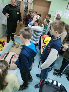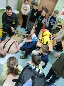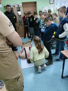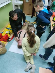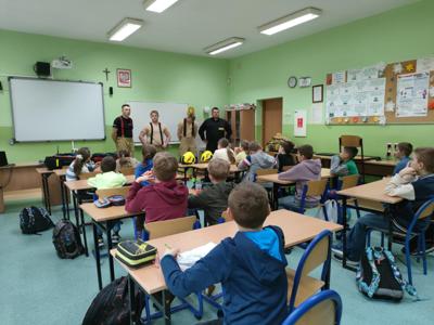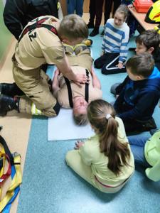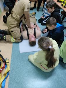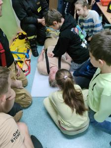 Udział naszych dzieci w zajęciach na temat pierwszej pomocy. Celem spotkania było przekazanie uczniom podstawowych umiejętności i wiedzy na temat udzielania pomocy w sytuacjach nagłych. Strażacy rozpoczęli zajęcia od wyjaśnienia, czym jest pierwsza pomoc i dlaczego jest tak ważna. Uczniowie dowiedzieli się, jak reagować w przypadku wypadków, omdleń, oparzeń oraz innych urazów. Strażacy szczególną uwagę zwrócili na to, jak należy udzielać pomocy poszkodowanym przed przybyciem służb ratunkowych, podkreślając wagę spokojnej reakcji i wezwania pomocy. W części praktycznej dzieci miały okazję nauczyć się podstawowych czynności, takich jak prawidłowe ułożenie poszkodowanego w pozycji bocznej, przeprowadzenie resuscytacji krążeniowo-oddechowej. Zajęcia były interaktywne, a uczniowie chętnie zadawali pytania i uczestniczyli w ćwiczeniach. Dzięki tym zajęciom uczniowie nie tylko poszerzyli swoją wiedzę, ale również poczuli się pewniej w sytuacjach, które mogą wymagać szybkiej reakcji.