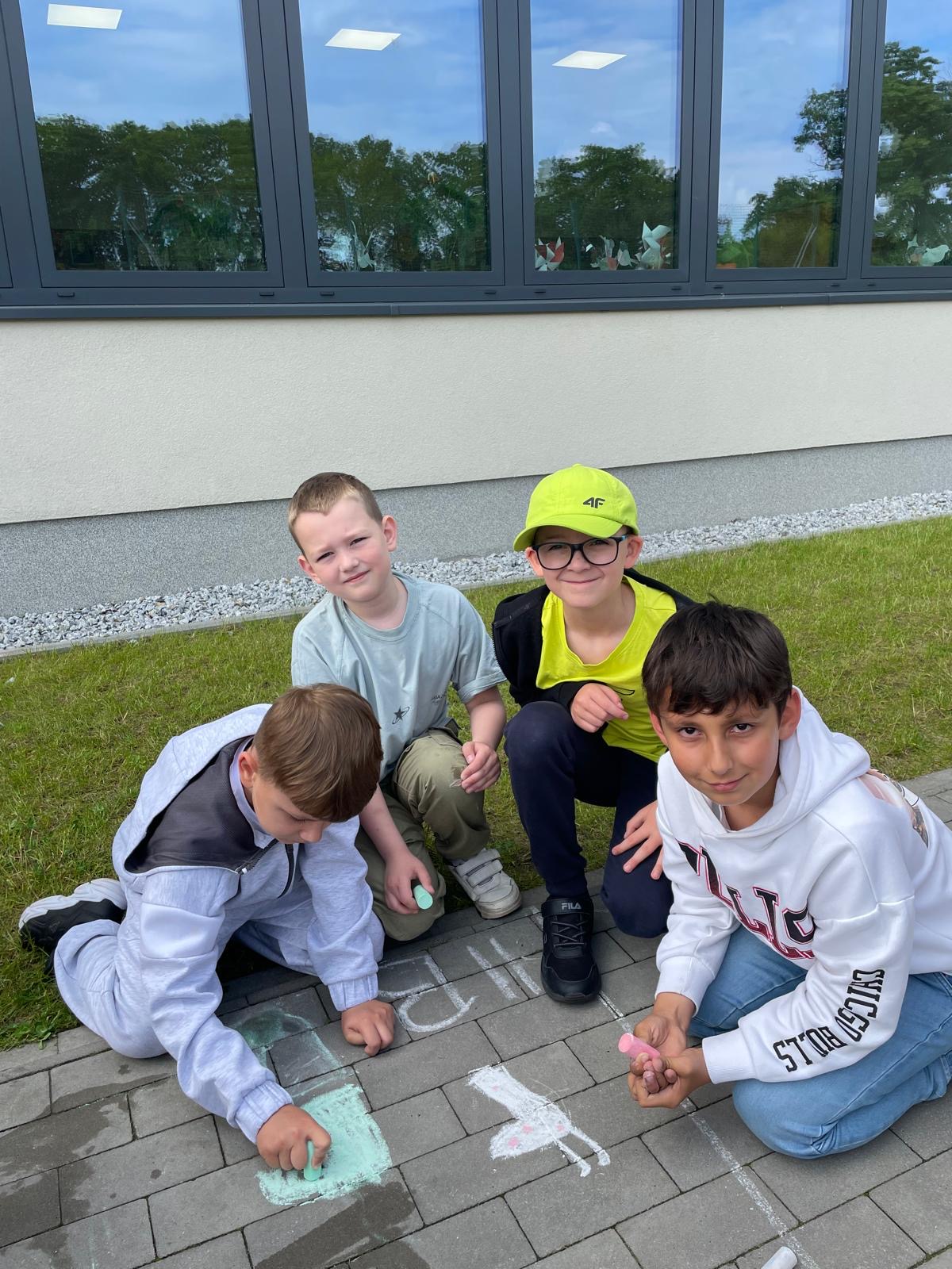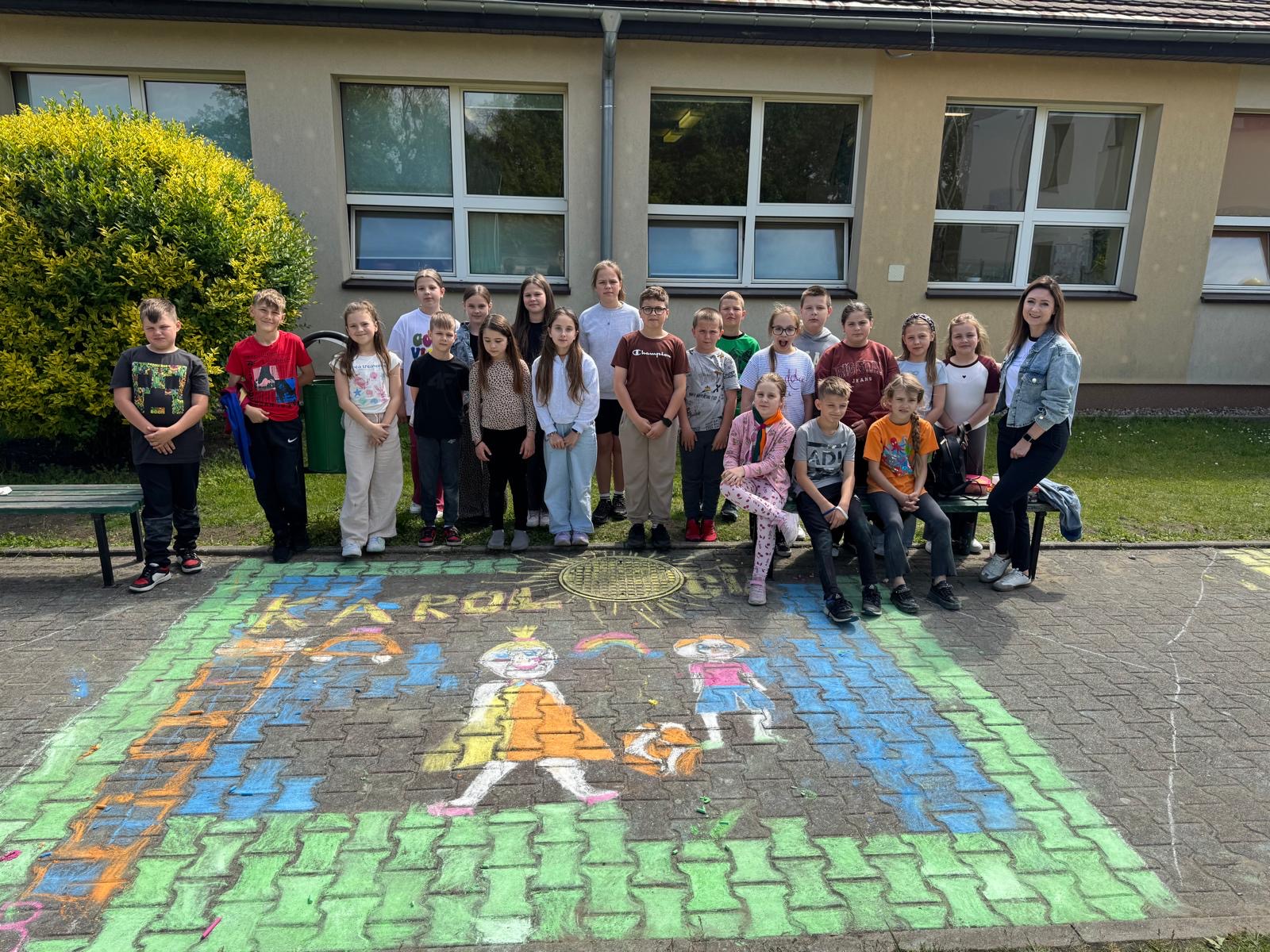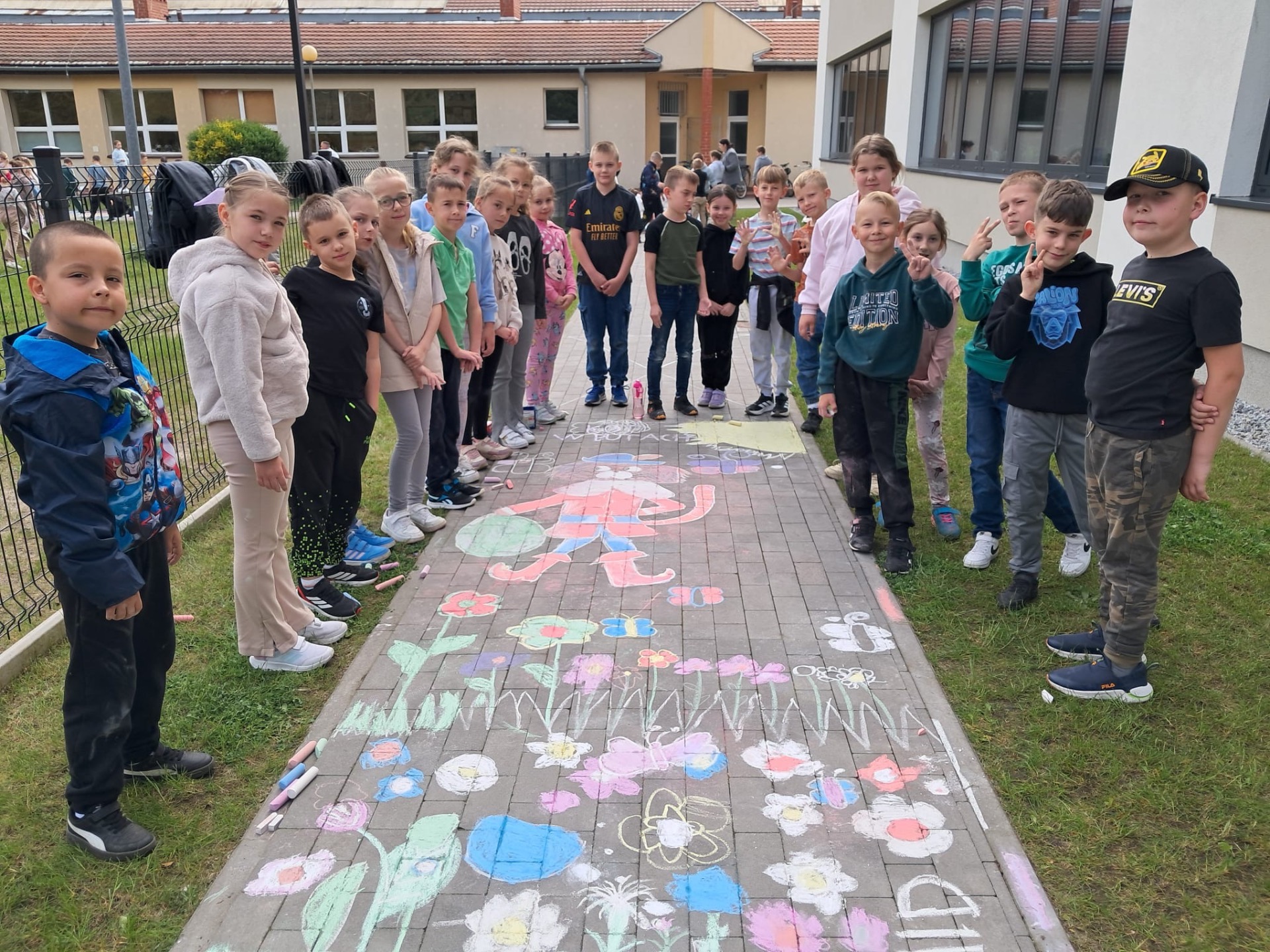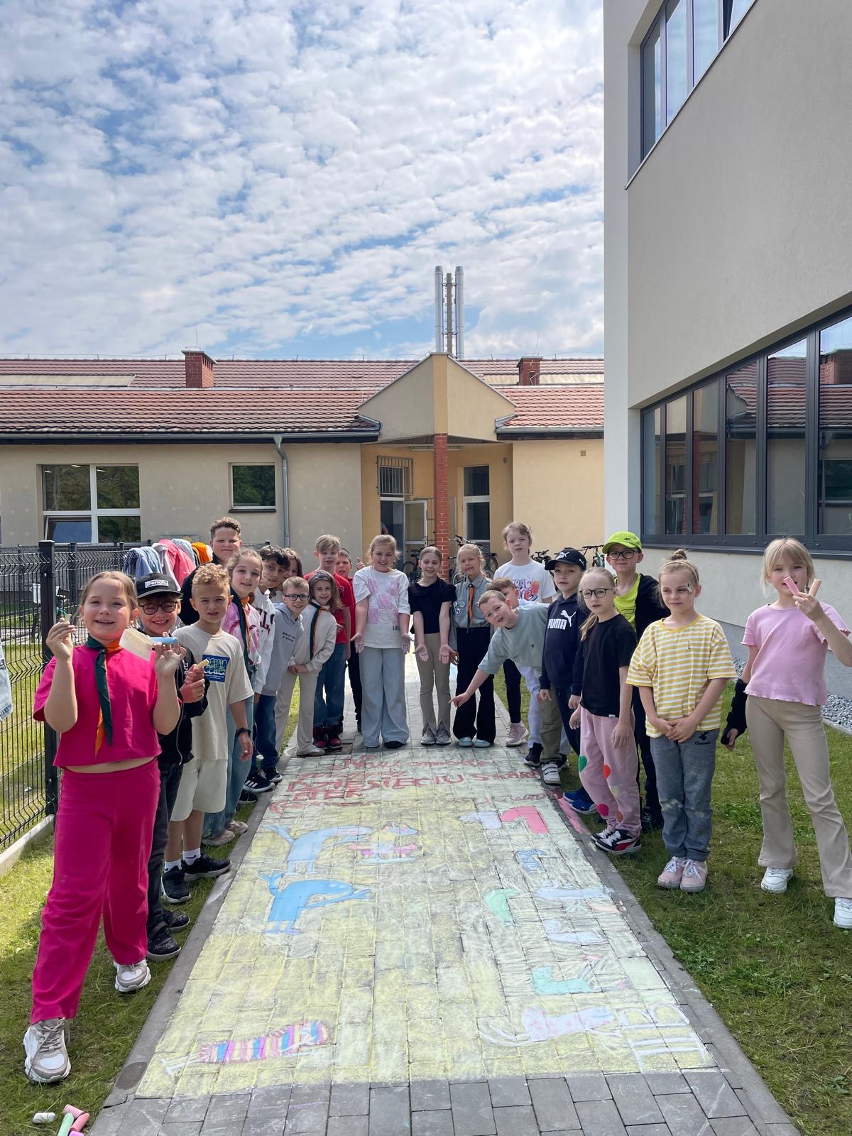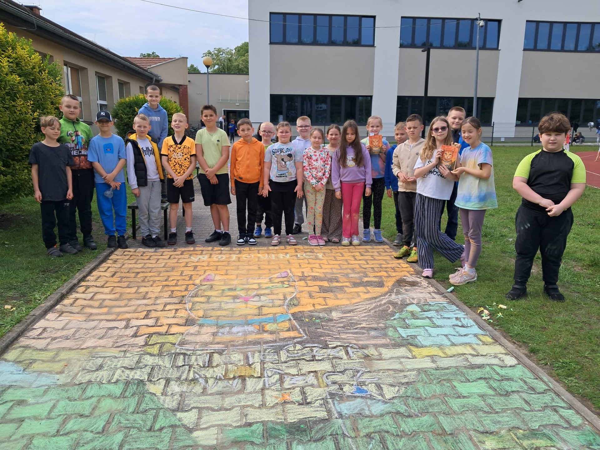 🎨 Szkolny chodnik przed wejściem ozdobiły kolorowe kredowe dzieła – uczniowie malowali okładki swoich ulubionych książek, dzieląc się tytułami, które ich inspirują i zachwycają.